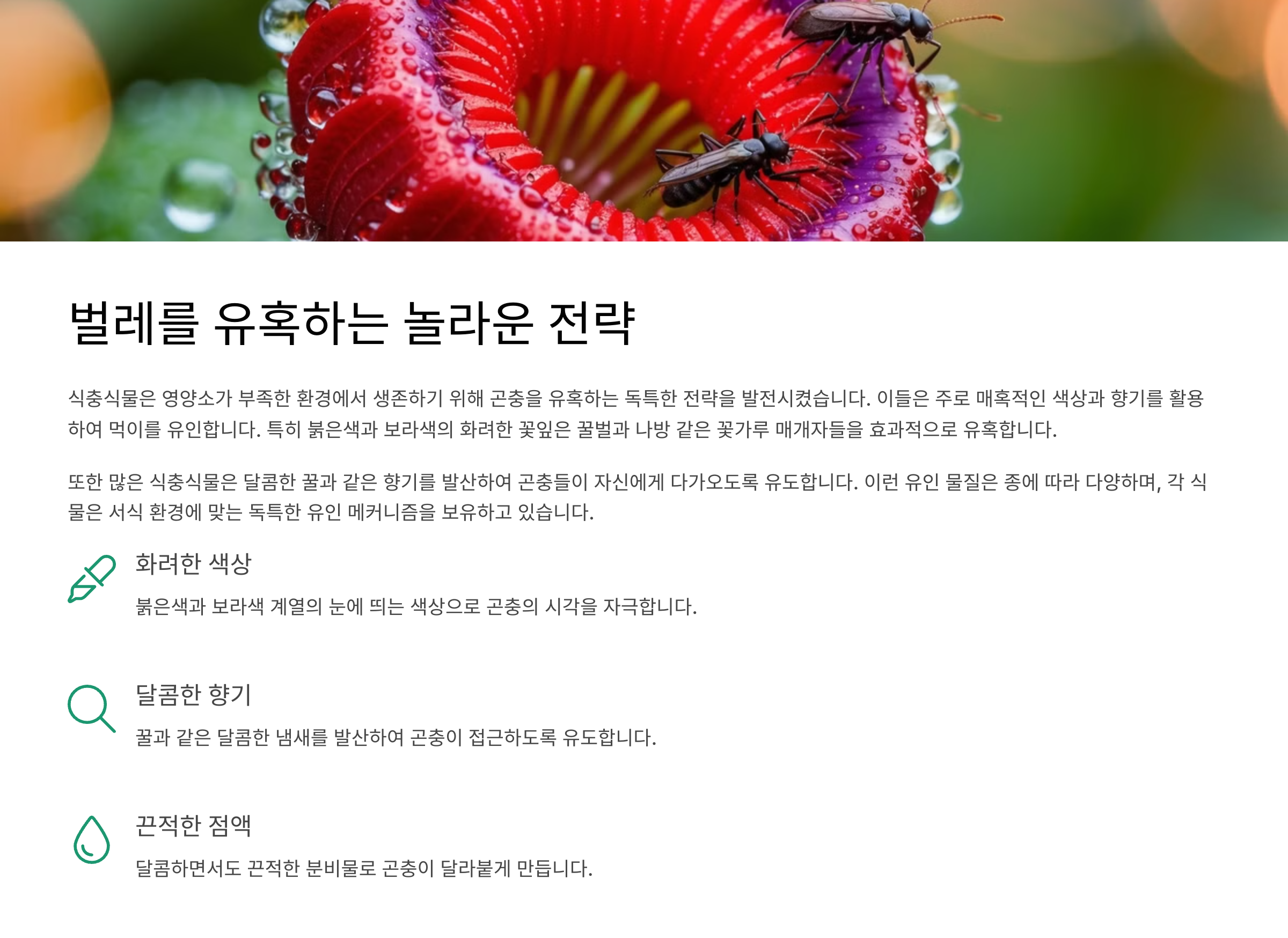 식충식물은 각자 독특한 방식으로 곤충을 유인하고 포획해요. 방식은 다르지만 공통된 목표는 단 하나! 바로 ‘추가적인 질소와 영양소 확보’랍니다.