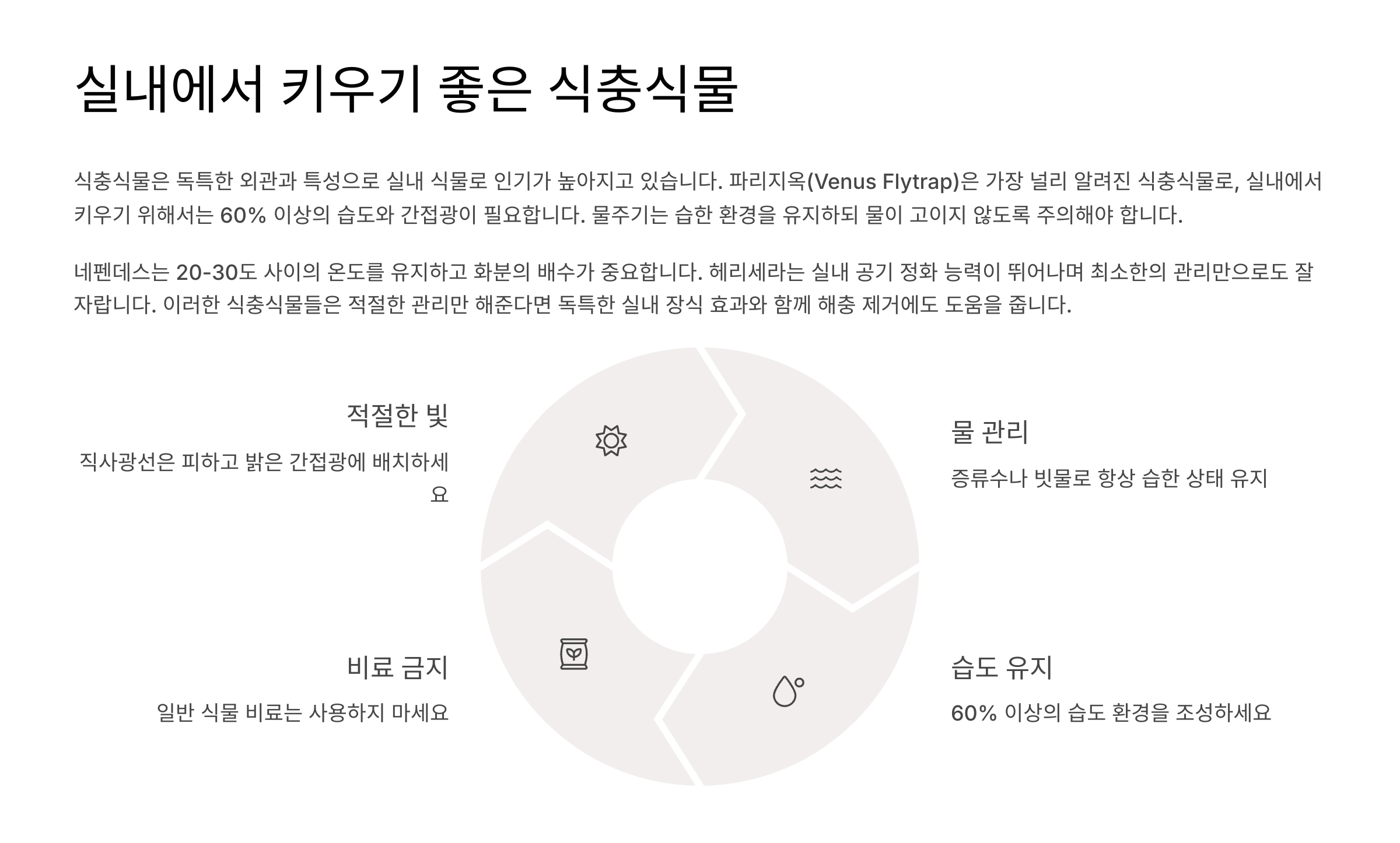 | 드로세라 | 끈끈한 점액, 관리 쉬움 | 창가 + 저면관수 |