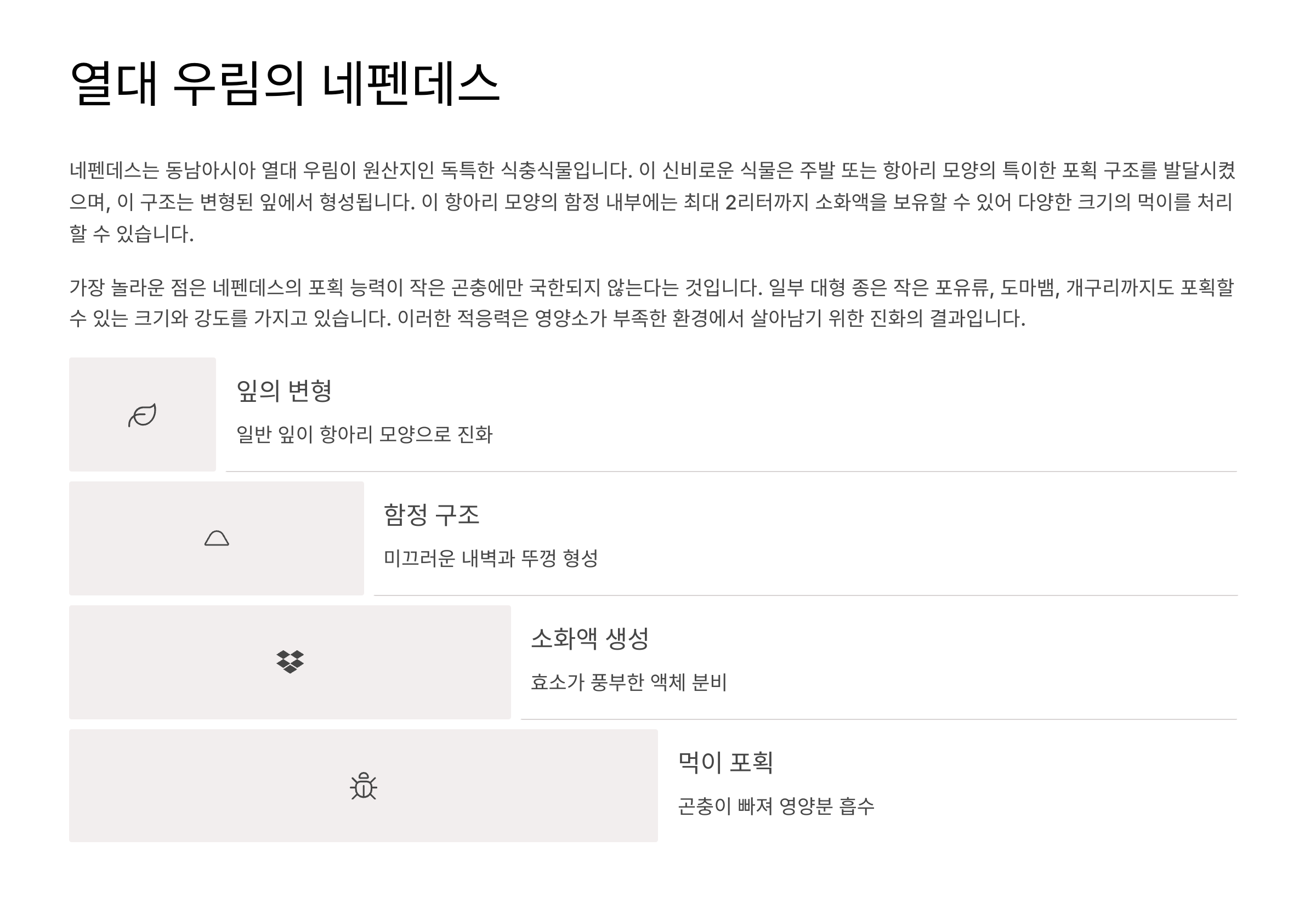 | 대표 식물 | 네펜데스, 통발 | 파리지옥, 드로세라 |