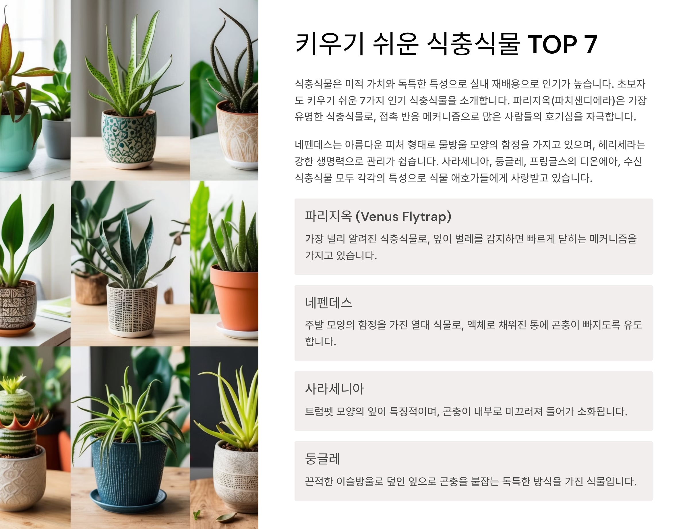 | 파리지옥 | 잎 닫힘 반응 | 베란다, 햇빛 필수 |