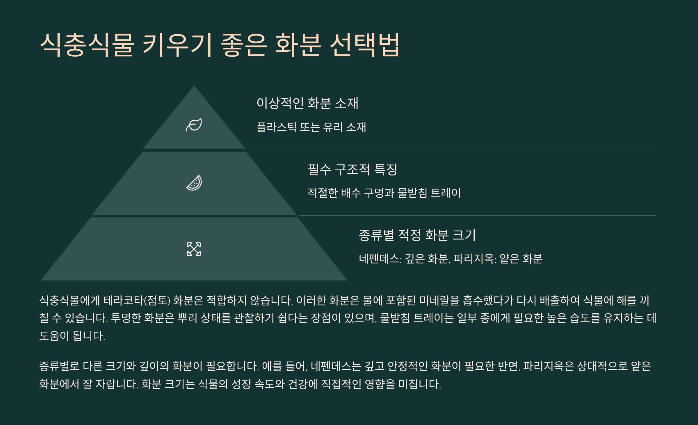 식충식물은 특별한 토양과 습도 관리가 필요한 만큼, 화분 선택도 정말 중요해요. 보기만 예쁜 화분보다는 기능 중심으로 고르는 게 식물 건강에 좋아요.