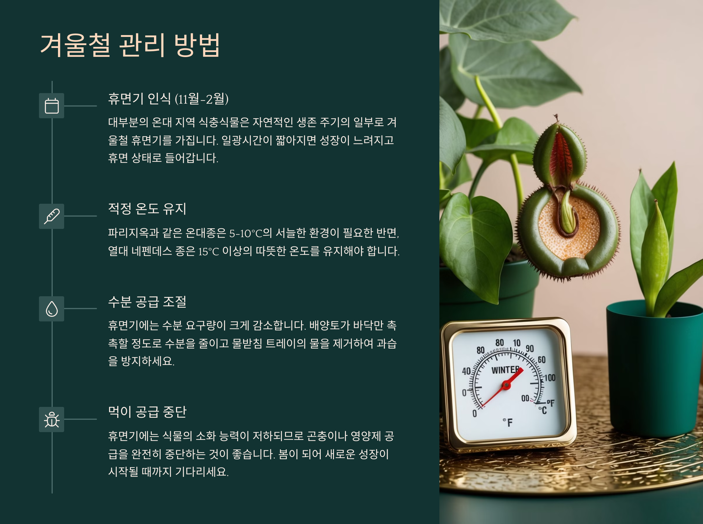 식충식물도 겨울이 되면 활동이 느려지거나 휴면기에 들어가요. 이 시기를 잘 관리해줘야 다음 봄에도 건강하게 자랄 수 있