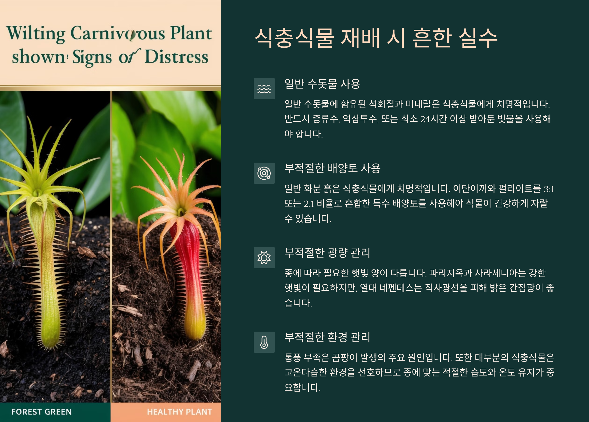 식충식물은 생각보다 키우기 쉬운 식물이지만, 몇 가지 실수만 피하면 훨씬 오래 건강하게 키울 수 있어요. 아래는 가장 흔한 실수들이에요.