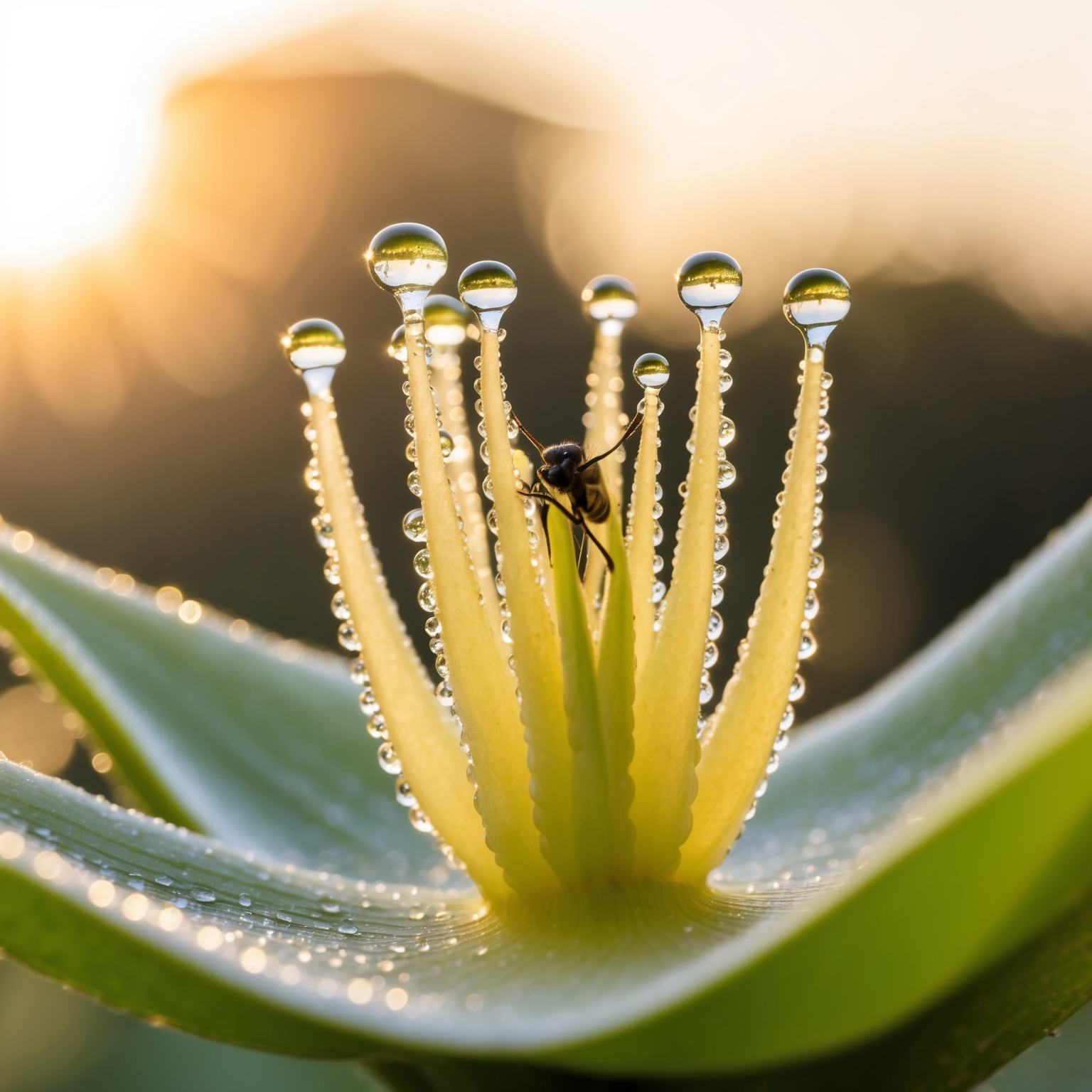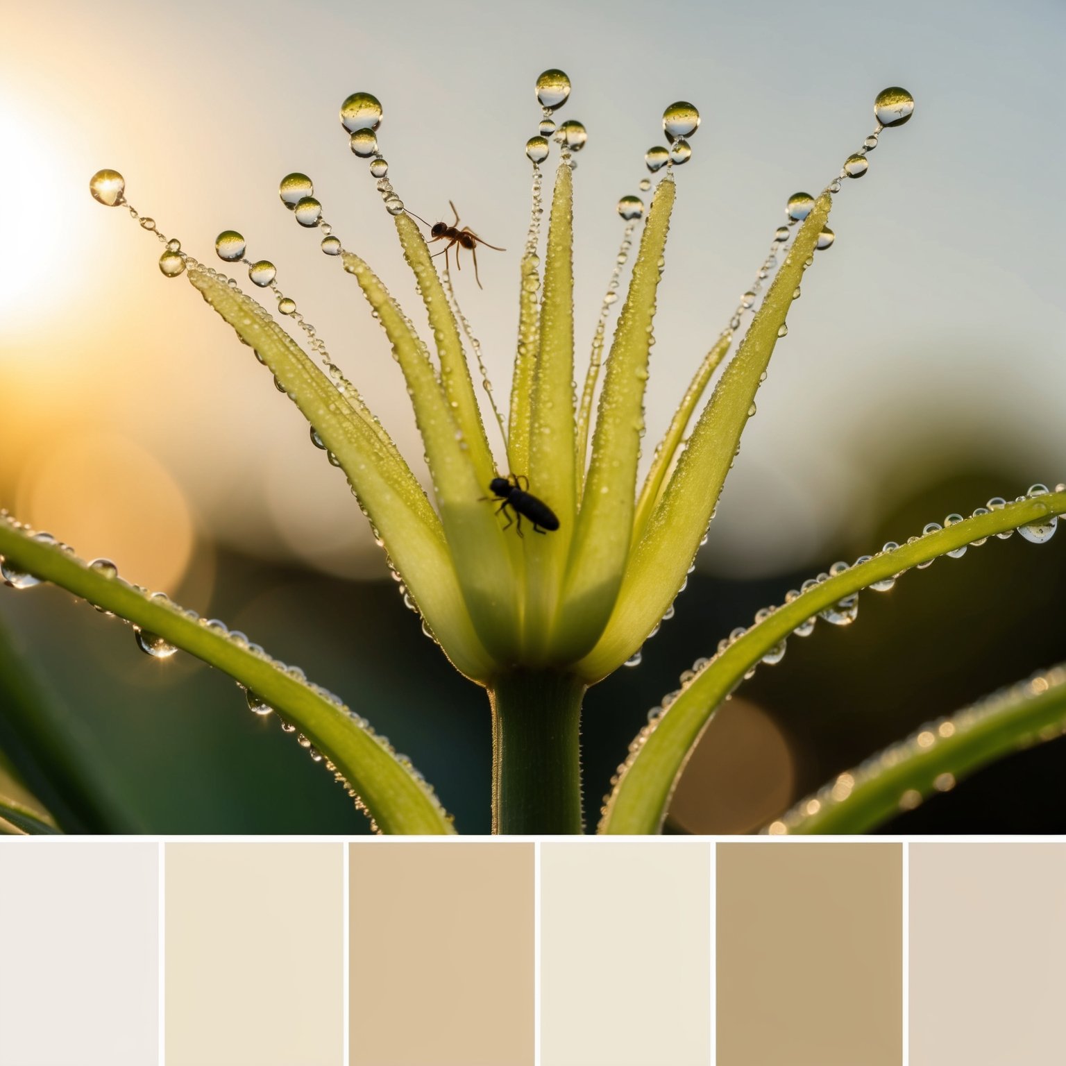 다음은 **끈끈이형 포획**이에요. 끈끈이주걱(Drosera)은 잎에 점액이 묻어 있어요. 이 액체는 달콤한 향으로 벌레를 유혹한 후, 한 번 달라붙으면 빠져나갈 수 없게 만들죠. 심지어 잎 전체가 천천히 말리면서 먹이를 감싸기도 해요. 말 그대로 식물판 '끈끈이 트랩'이에요.