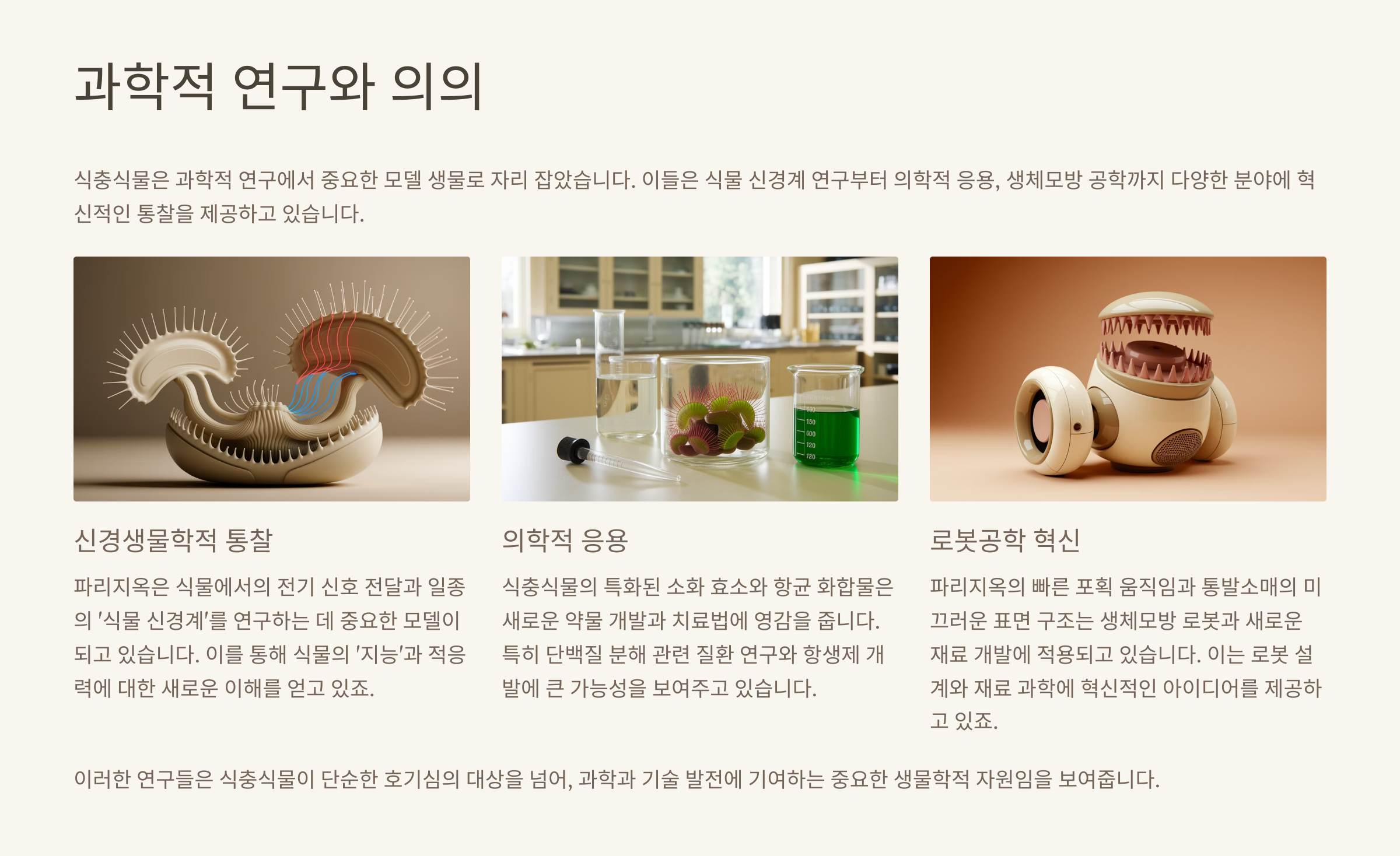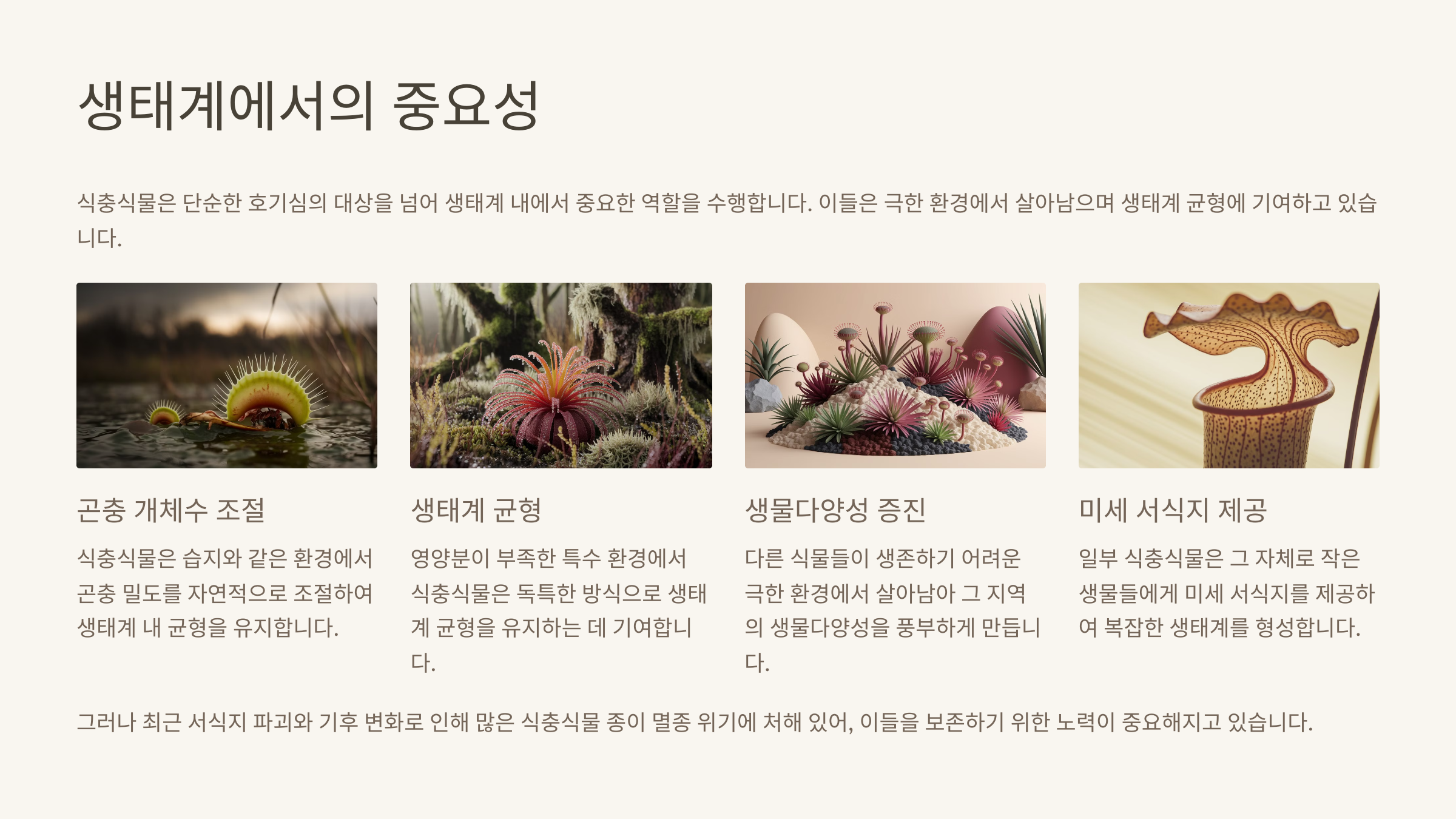 내가 생각했을 때 식충식물은 '귀찮은 식물'이 아니라 ‘대화가 필요한 식물’이에요. 살아 있는 벌레를 잡기 위해 똑똑한 진화를 거쳐왔고, 그만큼 섬세한 관심이 필요하죠. 이런 특별한 친구들과 함께 살아가는 법을 알아보면 정말 재밌답니다.