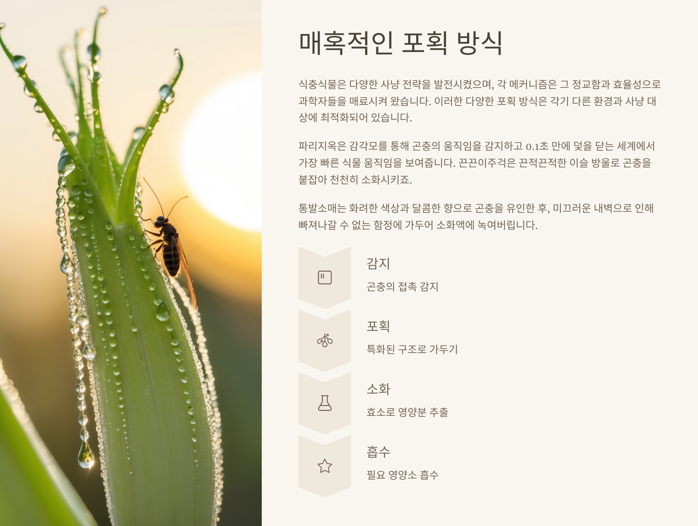가장 유명한 건 **움직임형 포획**이에요. 대표적으로 파리지옥(Venus flytrap)은 잎 안쪽에 민감한 촉각 센서를 가지고 있어요. 벌레가 두 번 닿으면 1초도 안 돼서 뚜껑이 닫히며 가둬요. 완전히 닫힌 후엔 소화액을 분비해서 먹이를 분해하죠. 정말 신기한 메커니즘이에요.