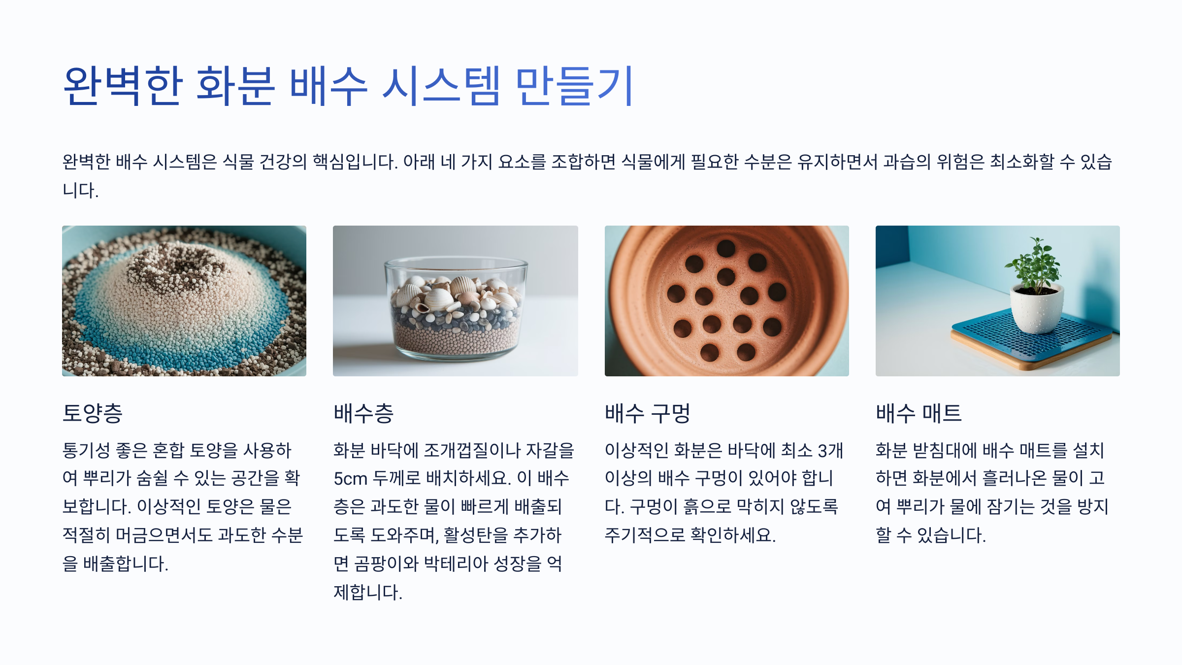 1. **배수구 있는 화분 사용** – 기본 중의 기본이에요. 바닥에 구멍이 없는 화분은 장식용으로만 쓰고, 실제 식물은 반드시 구멍이 있는 화분에 심어야 해요.