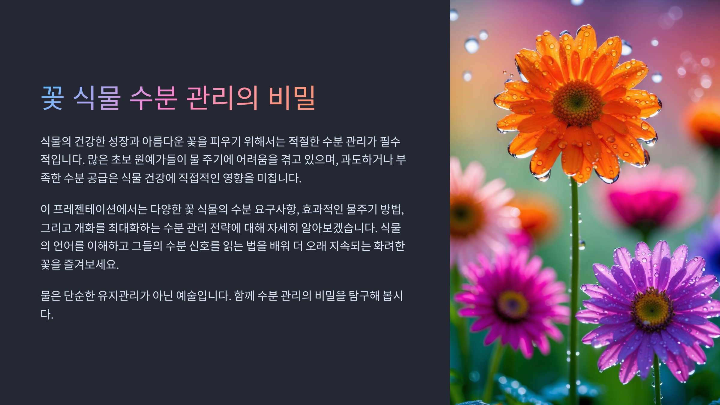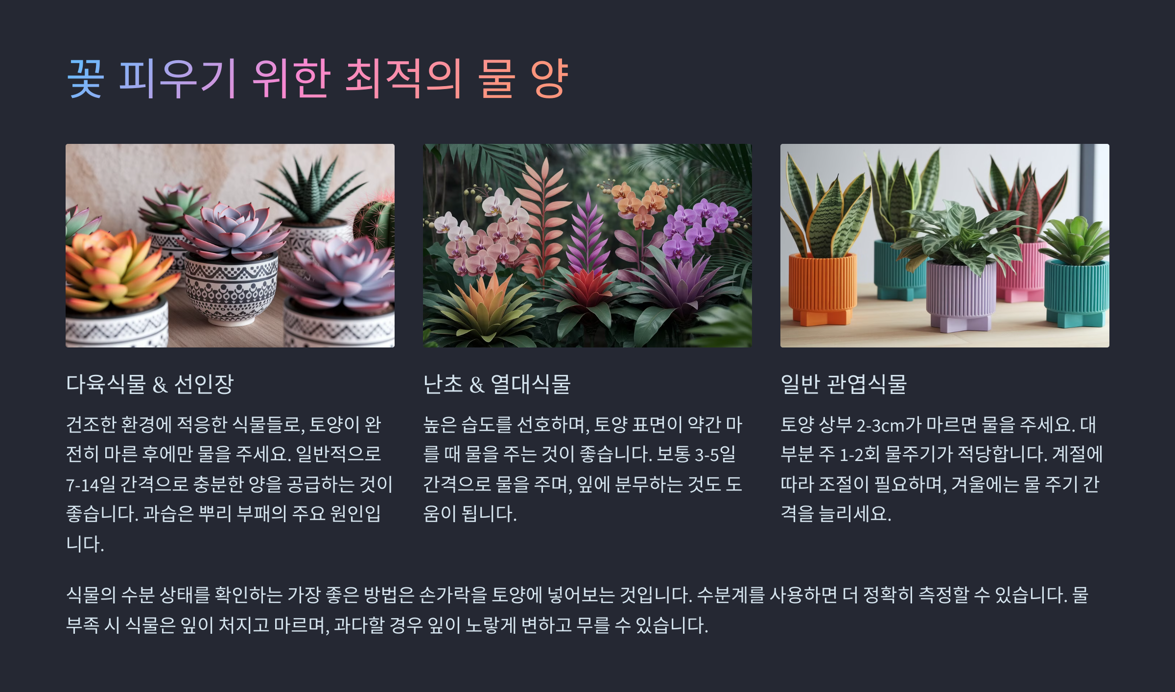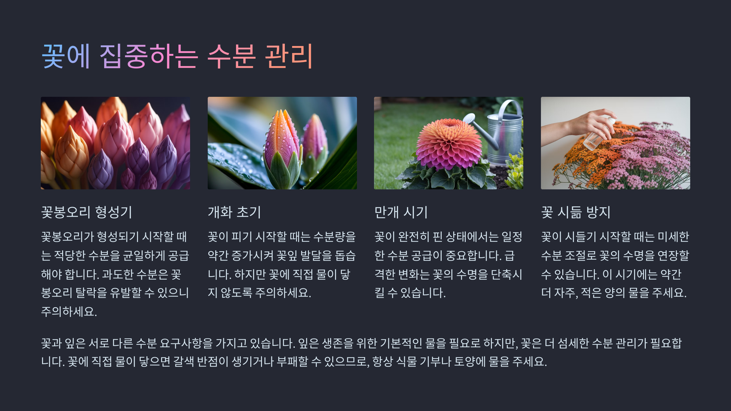 내가 생각했을 때, 꽃은 식물의 진심이에요. 꽃을 오래 피워주는 건 식물의 에너지를 지켜주는 거나 다름없어요. 그러니까 오늘은 꽃 중심으로 우리 초록 친구들을 보살펴보자고요! 😊