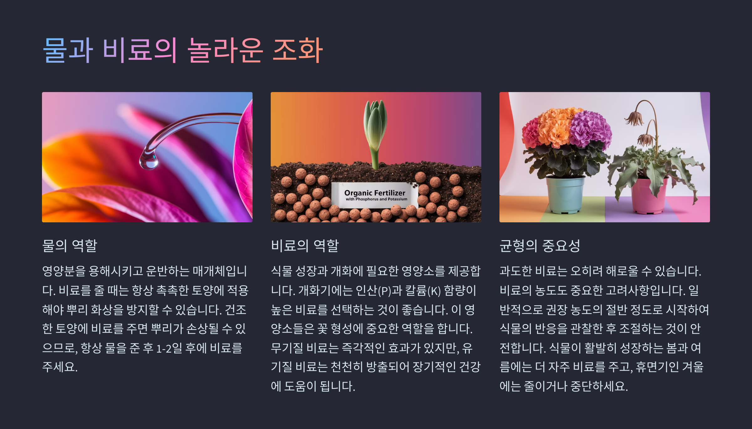 예를 들어, **물이 부족한 상태에서 비료를 주면** 뿌리가 타버릴 수 있어요. 반대로 **비료를 준 뒤 바로 물을 너무 많이 주면** 영양분이 다 빠져나가죠. 딱 적당히, 천천히가 포인트예요.