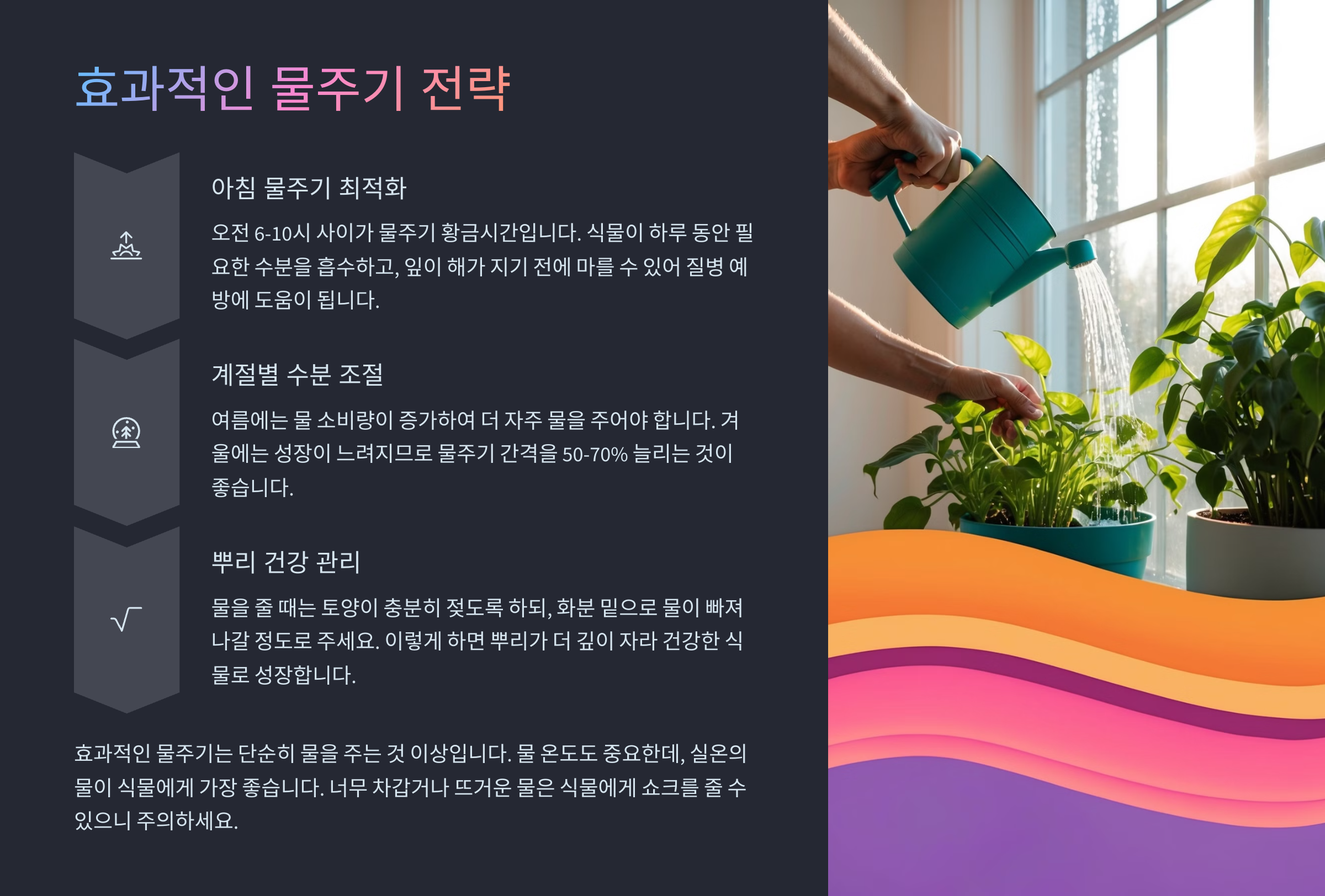 가장 이상적인 건 '물주는 리듬을 일정하게 유지'하는 거예요. 아침 또는 저녁 일정한 시간대에 주고, 주는 양도 비슷하게 맞춰주는 게 좋아요. 이러면 식물도 예측 가능한 환경에서 더 안정적으로 꽃을 피워요.