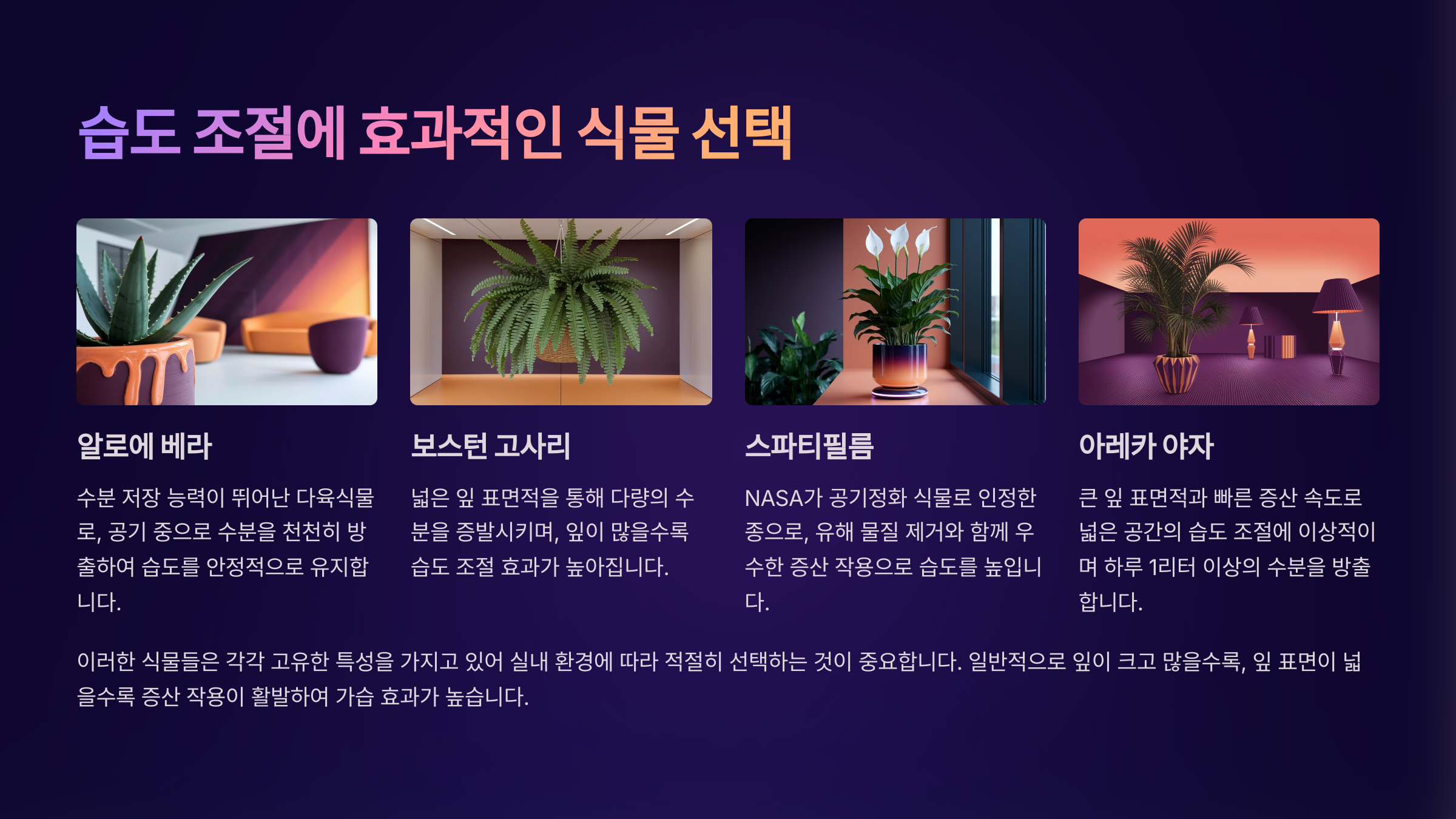 습도 조절에 도움되는 식물을 고를 땐 '수분을 좋아하고 자주 물이 필요한' 식물을 기준으로 보면 좋아요. 이런 식물은 뿌리가 왕성하고, 잎의 표면적이 넓은 경우가 많아요.