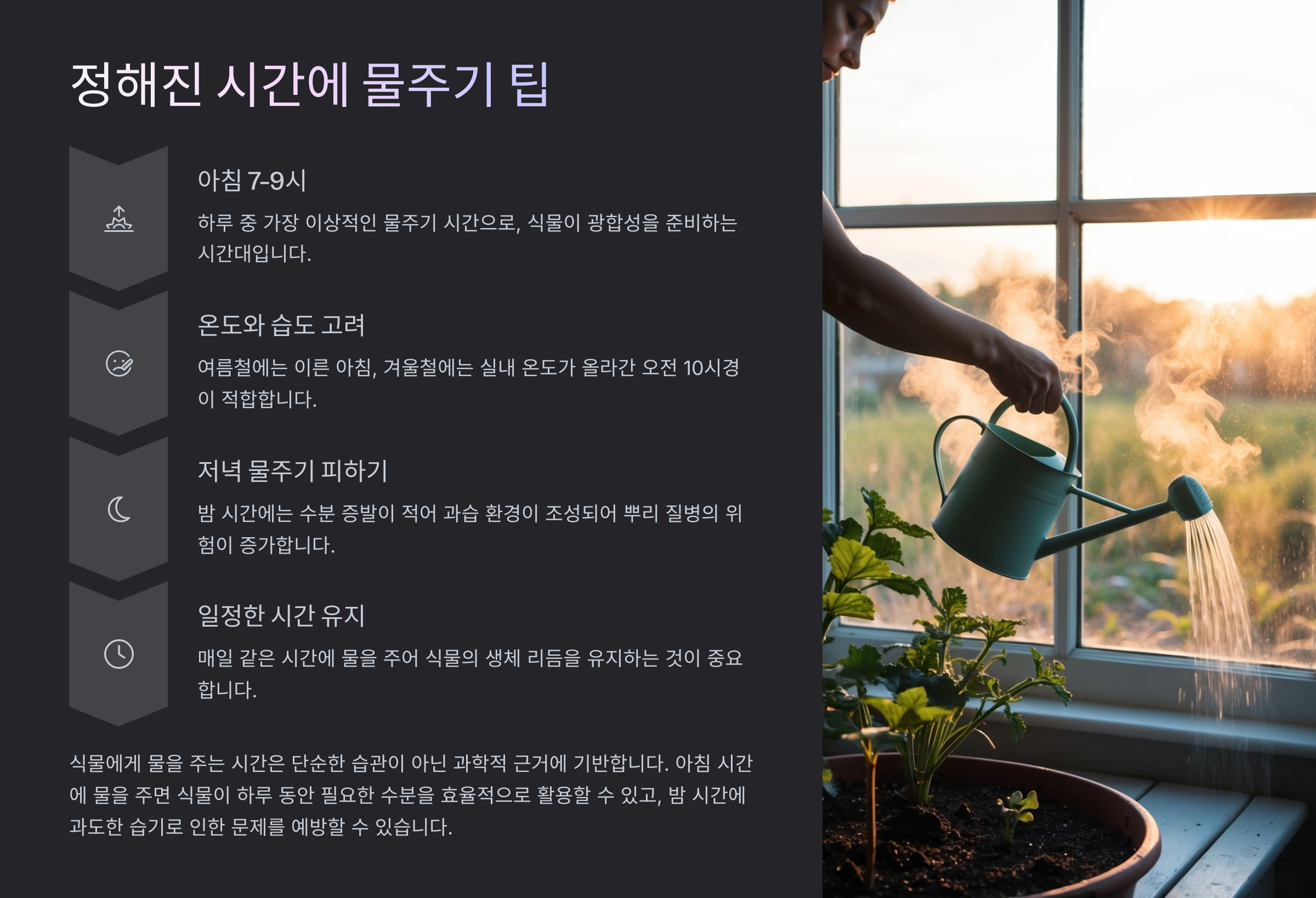 하루에 물을 주는 식물이라면, 정확한 '시간대' 선택이 중요한 이유는 식물의 광합성과 흡수 리듬에 맞춰 수분을 제공해야 효율적으로 쓰일 수 있기 때문이에요. 특히 아침 시간대는 물을 흡수하고 하루 활동에 쓸 수 있는 최적의 타이밍이에요.
