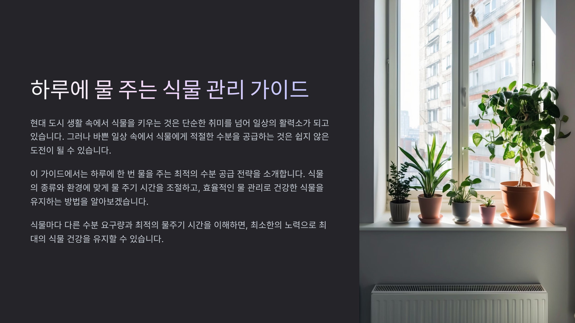 하루에 물을 주는 식물이라면, 정확한 '시간대' 선택이 중요한 이유는 식물의 광합성과 흡수 리듬에 맞춰 수분을 제공해야 효율적으로 쓰일 수 있기 때문이에요. 특히 아침 시간대는 물을 흡수하고 하루 활동에 쓸 수 있는 최적의 타이밍이에요.