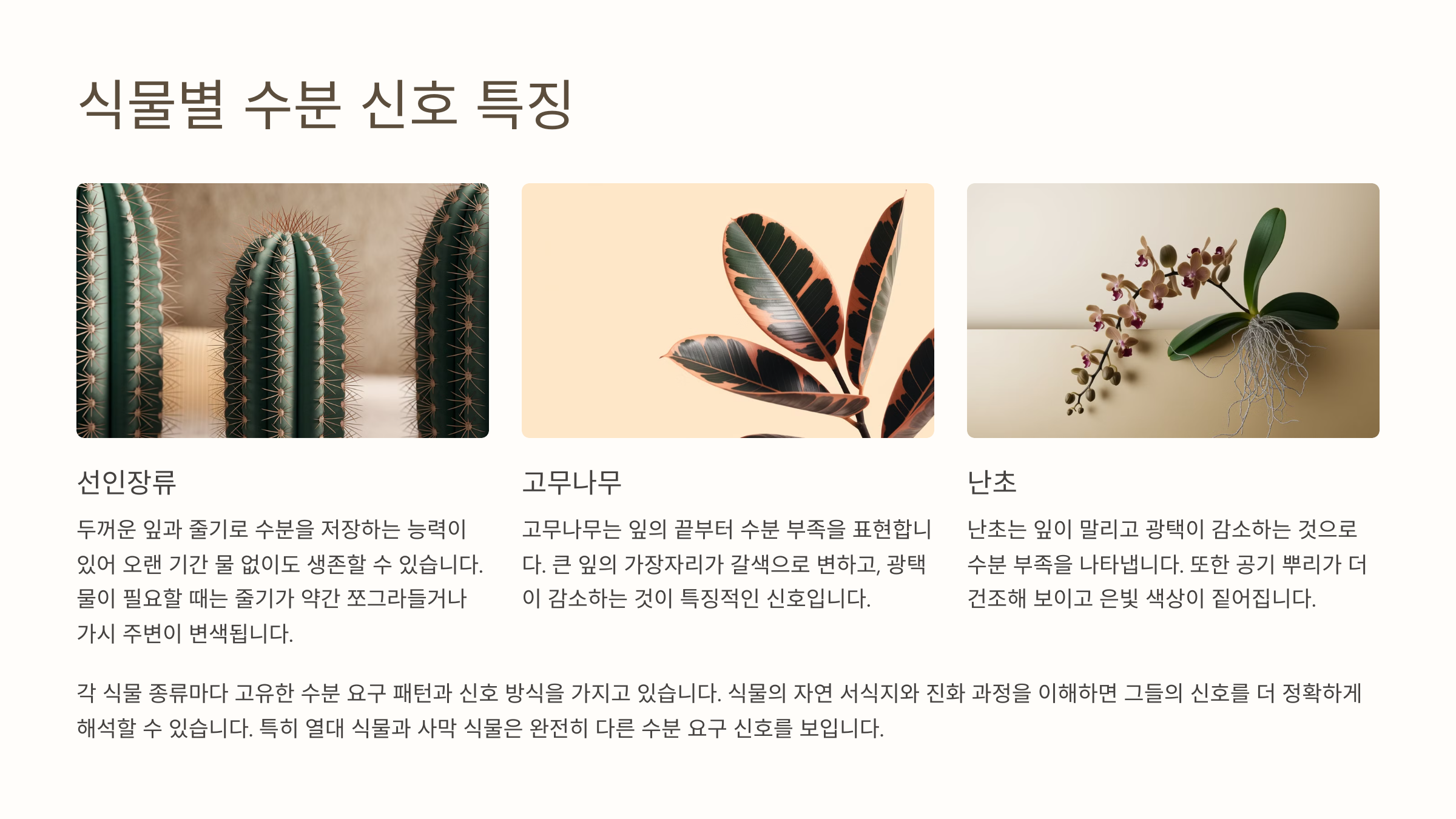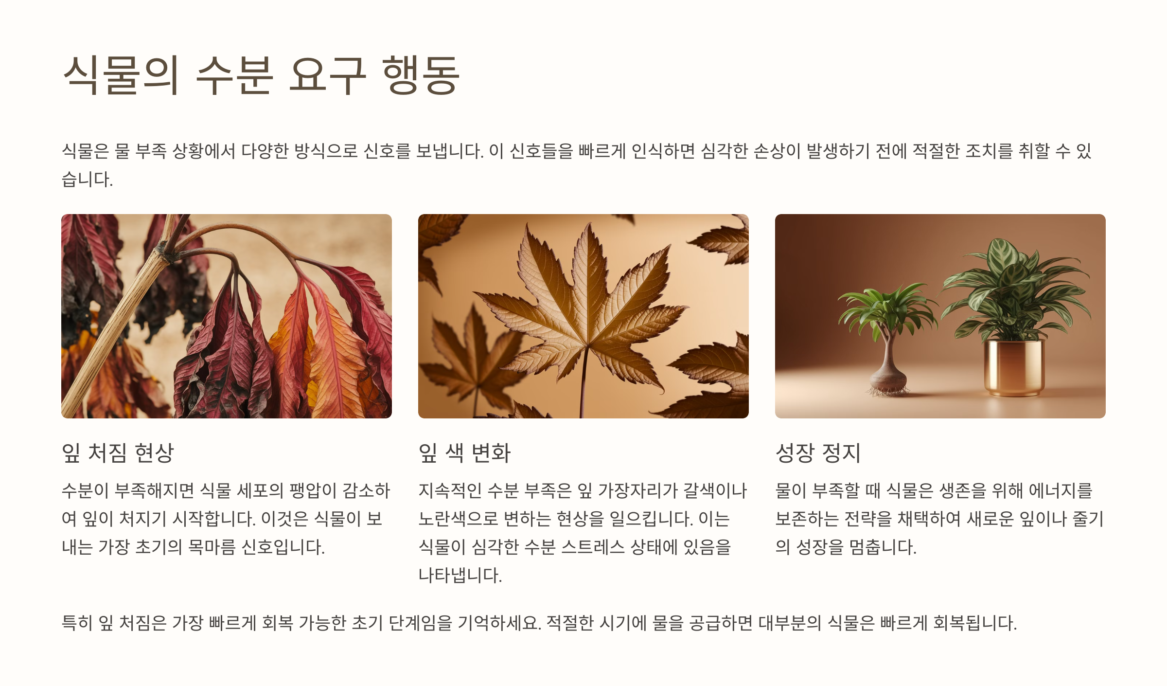 | 식물 이름 | 물 필요 신호 | 회복 반응 |