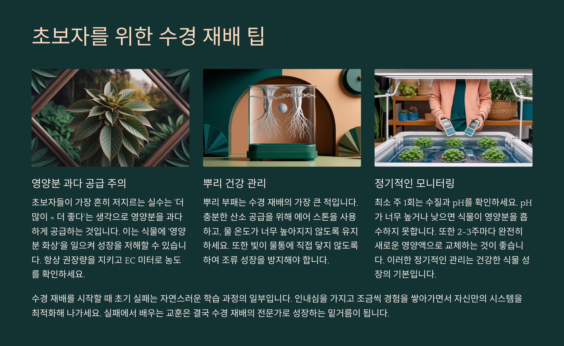 빛, 물, 영양소의 균형을 유지하는 것만 잘해도 수경 재배는 절반은 성공한 거예요. 이제 마지막 고비, 초보자들이 흔히 하는 실수들과 그 대처법까지 알아봐야겠죠? ⚠️