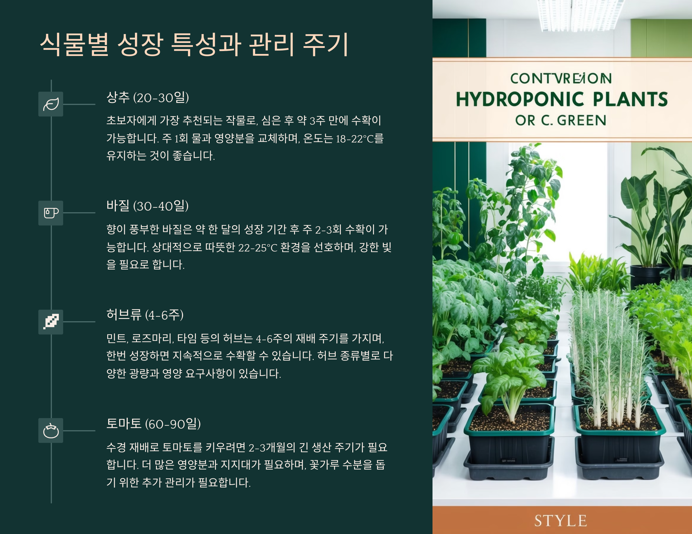 수경 재배를 성공적으로 유지하려면 식물이 자라는 속도에 따라 물 교체, 영양제 추가, 빛 노출 시간 등을 맞춰주는 게 중요해요. 식물마다 성장 속도와 요구 조건이 다르기 때문에, 종류별 특징을 잘 파악해야 해요. 📊