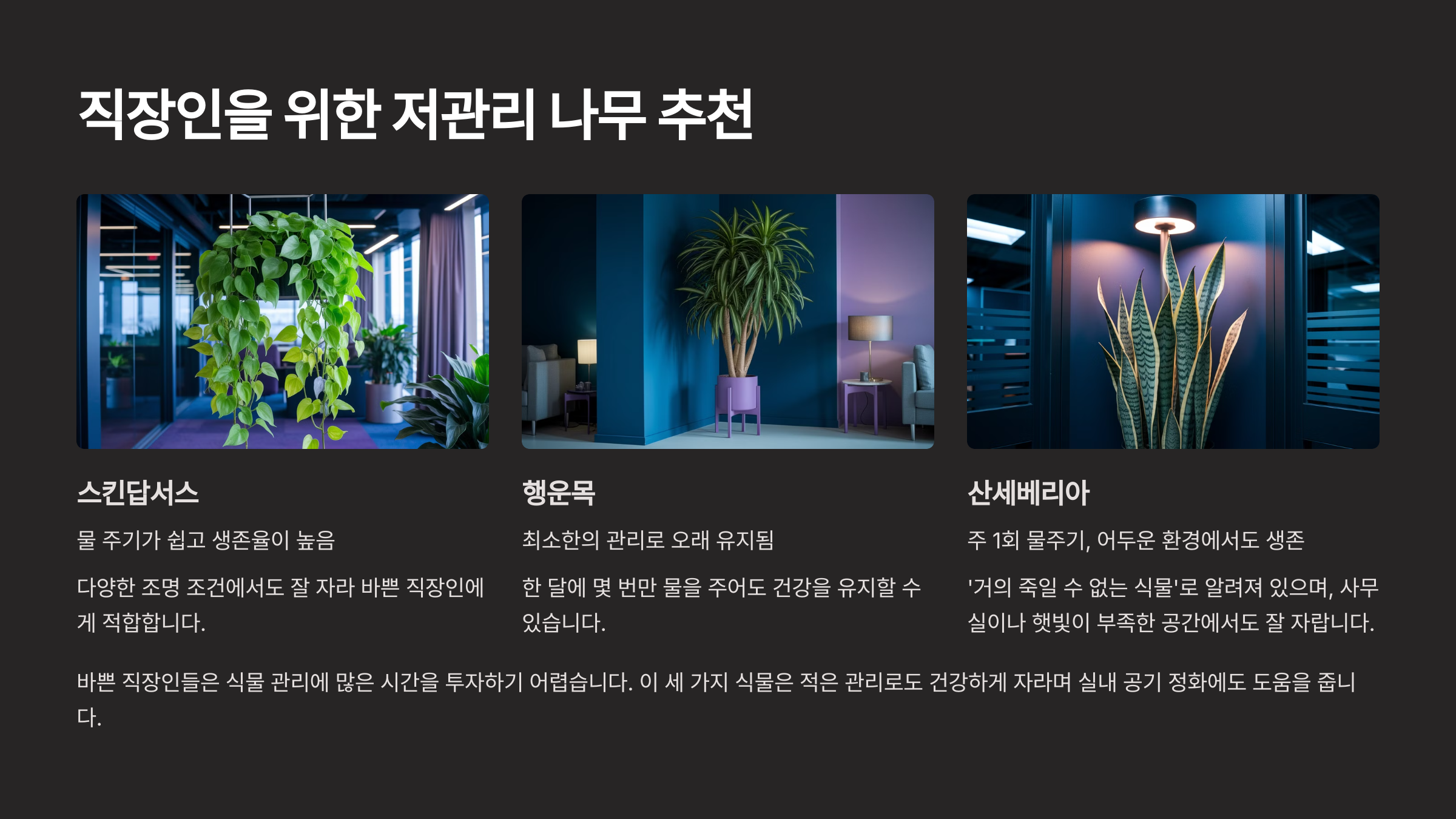 회사나 공부방 같은 공간엔 물 주기 까먹어도 잘 사는 식물이 최고죠. 바쁜 직장인이나 학생들에게는 관리가 적으면서도 공기정화 기능이 좋은 식물이 필요해요 🪴