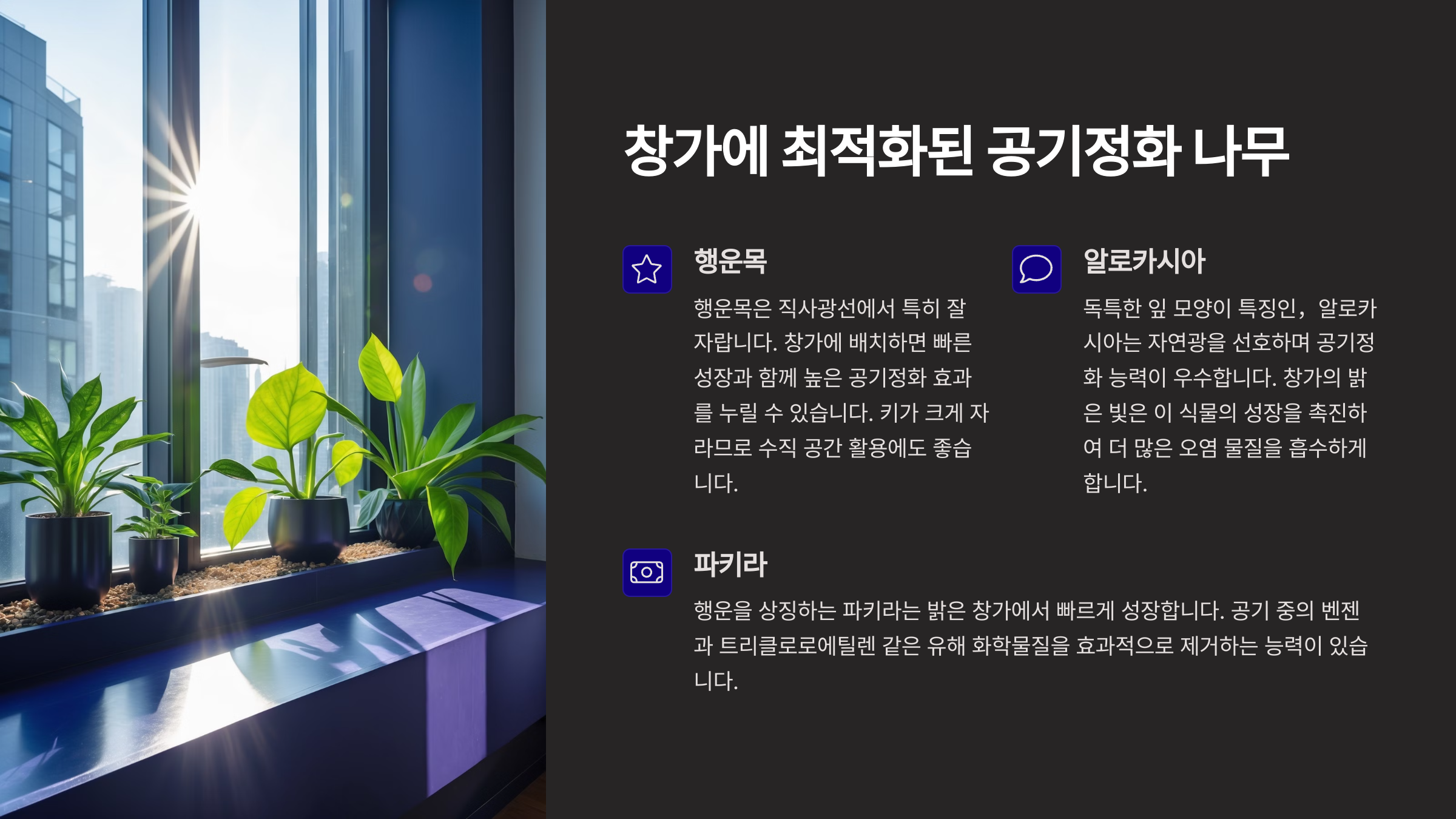 햇살이 잘 드는 창가에는 햇빛을 좋아하는 식물이 제격이에요. 충분한 빛을 받으면 광합성도 활발히 이뤄지고, 공기정화 효과도 배가되죠. 게다가 이 식물들은 인테리어적으로도 톡톡한 역할을 해요.