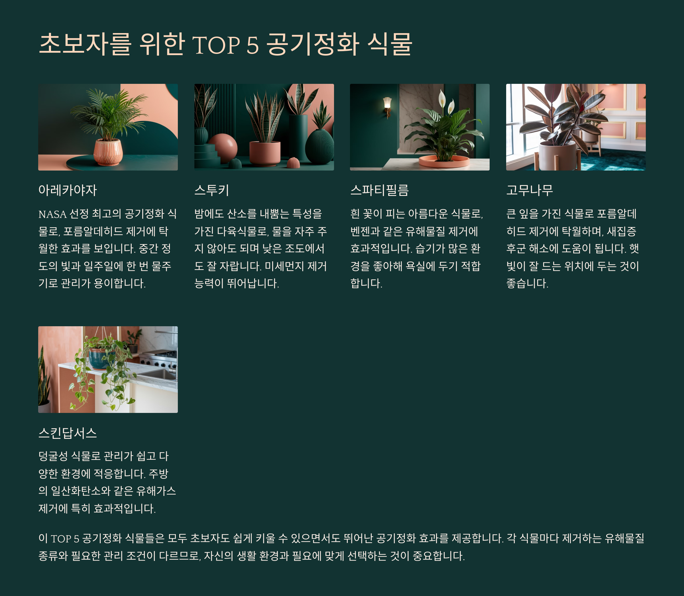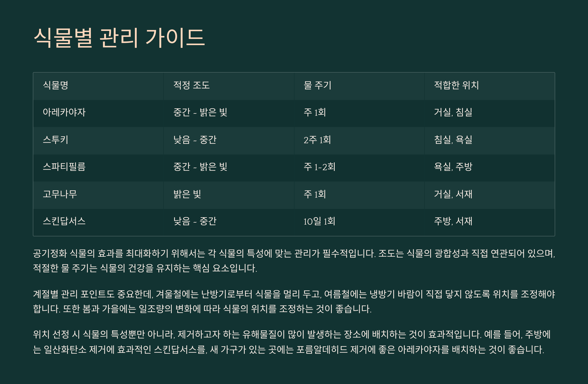이 식물들은 자연이 만든 최고의 공기청정기예요. 화학 필터 없이도 이만큼 공기를 정화할 수 있다는 게 정말 놀랍죠 🌱