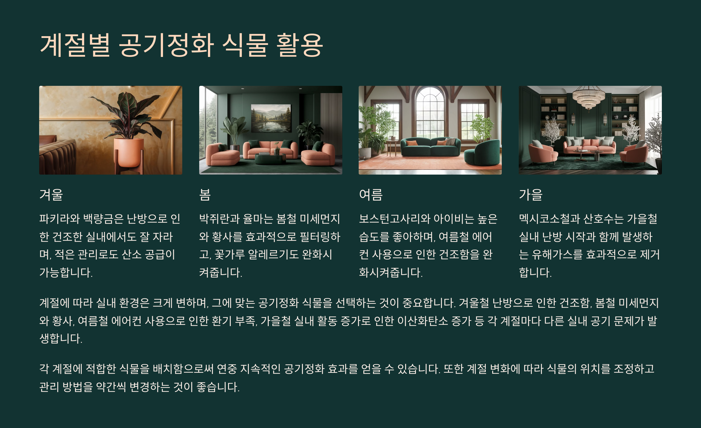 | 여름 | 아레카야자 | 습도 조절, 청량감 |
