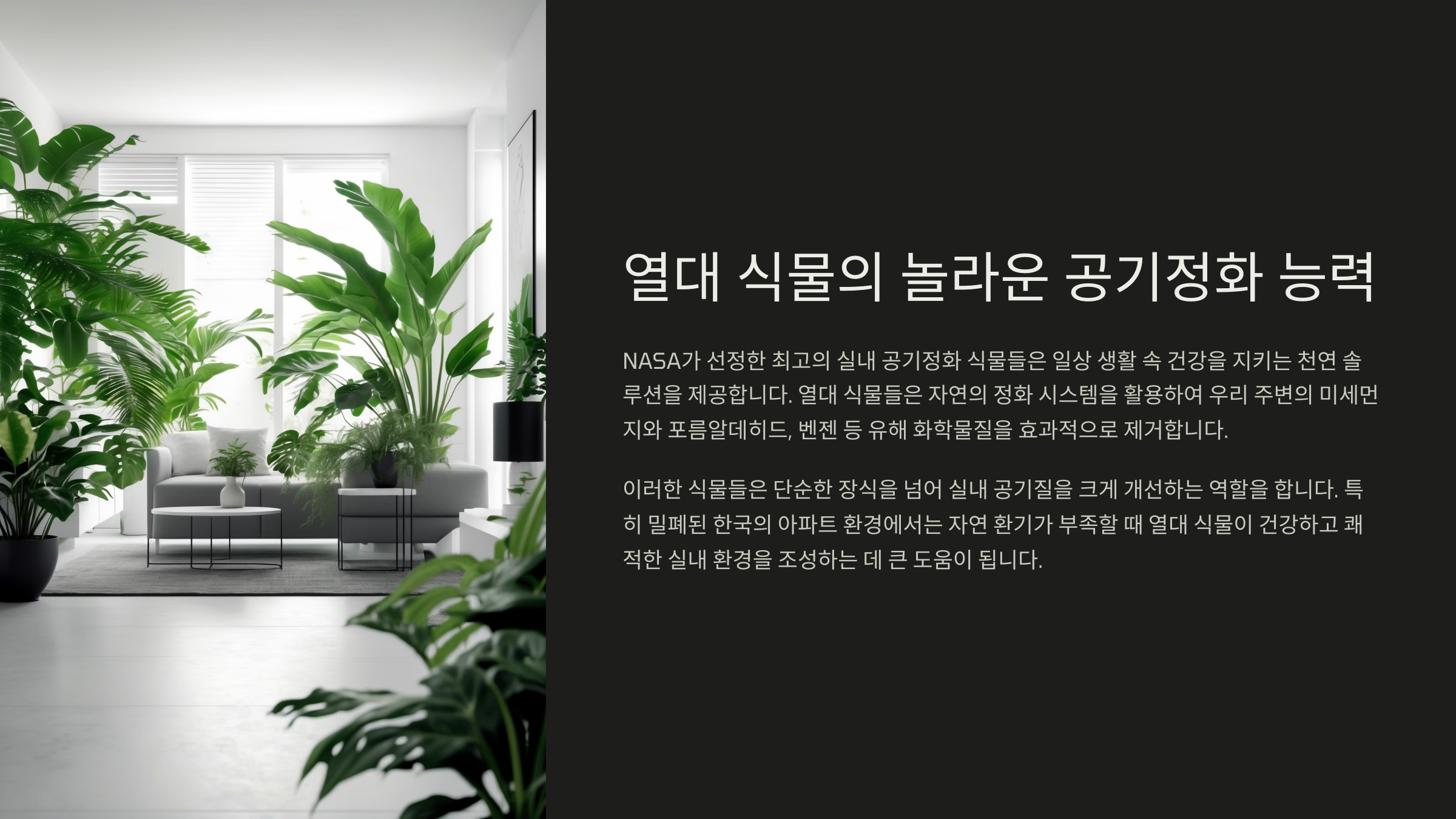 거실은 집에서 가장 넓고 사람들이 자주 머무는 공간이에요. 그래서 공기정화 효과가 뛰어난 식물을 두면 쾌적함이 확 올라가죠. 동시에 인테리어 효과까지 잡을 수 있는 식물을 추천할게요 🌟