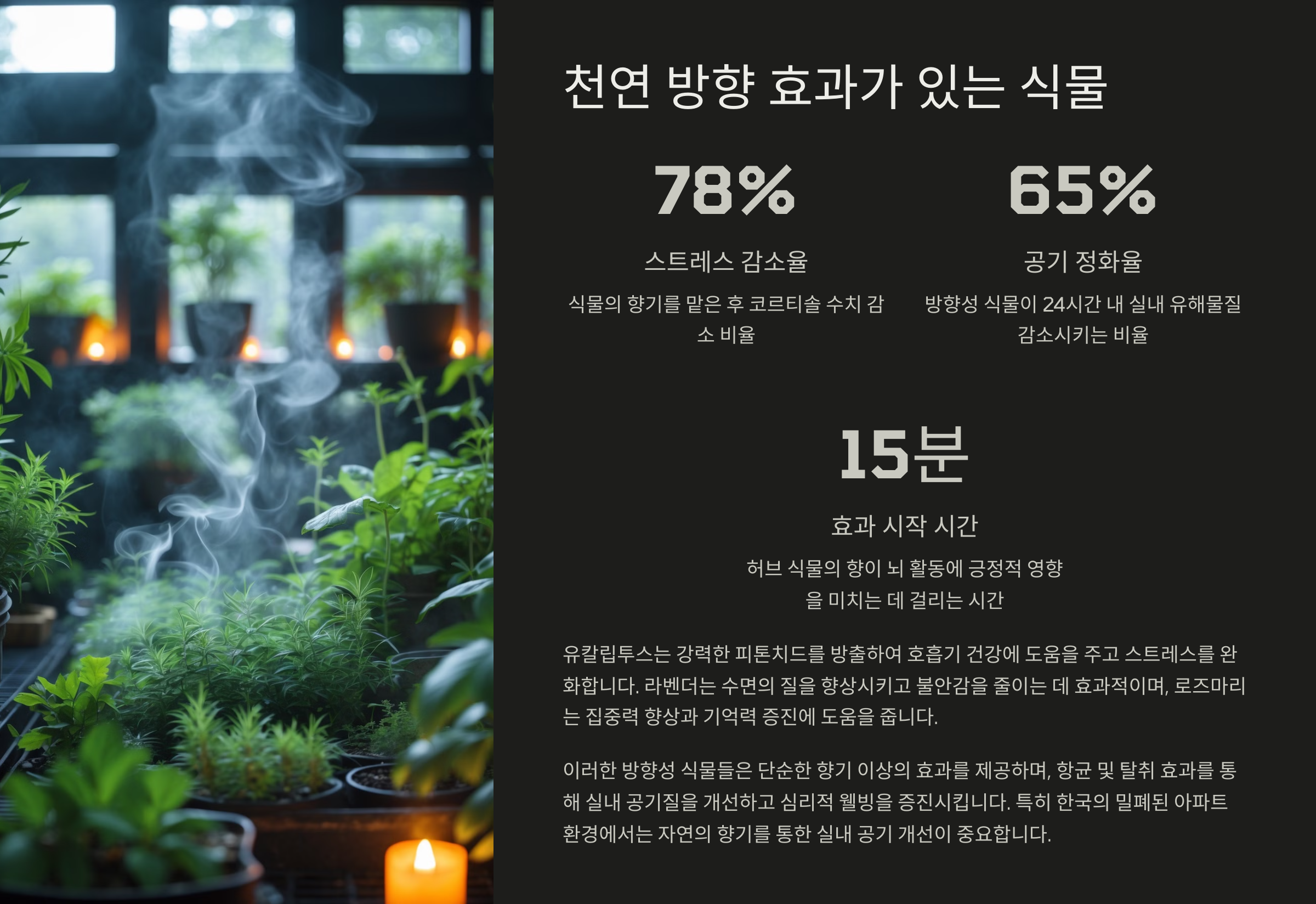 | 유칼립투스 | 청량한 향, 스트레스 완화 | 거실, 사무공간 |