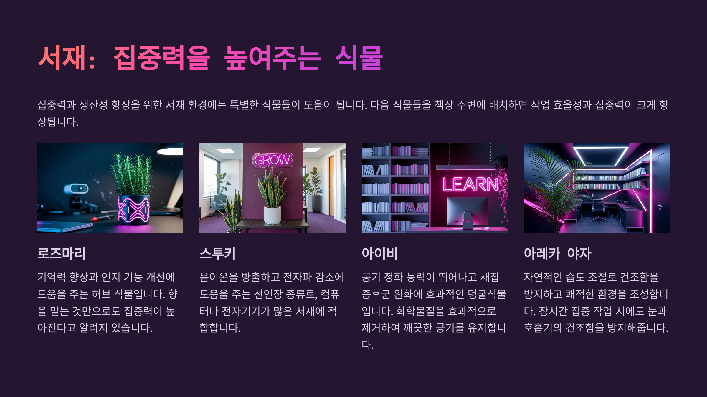 공부나 업무에 몰입하고 싶을 땐 주변 환경이 정말 중요하죠. 시야를 맑게 하고, 두통을 완화시키거나 공기 중 이산화탄소를 줄여주는 식물이 집중력을 높여줘요 ✏️