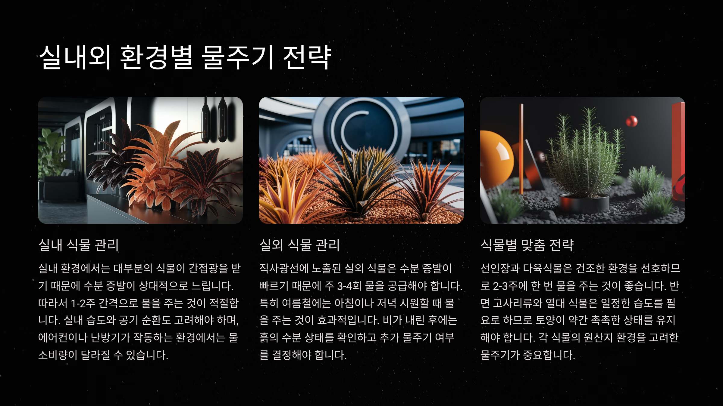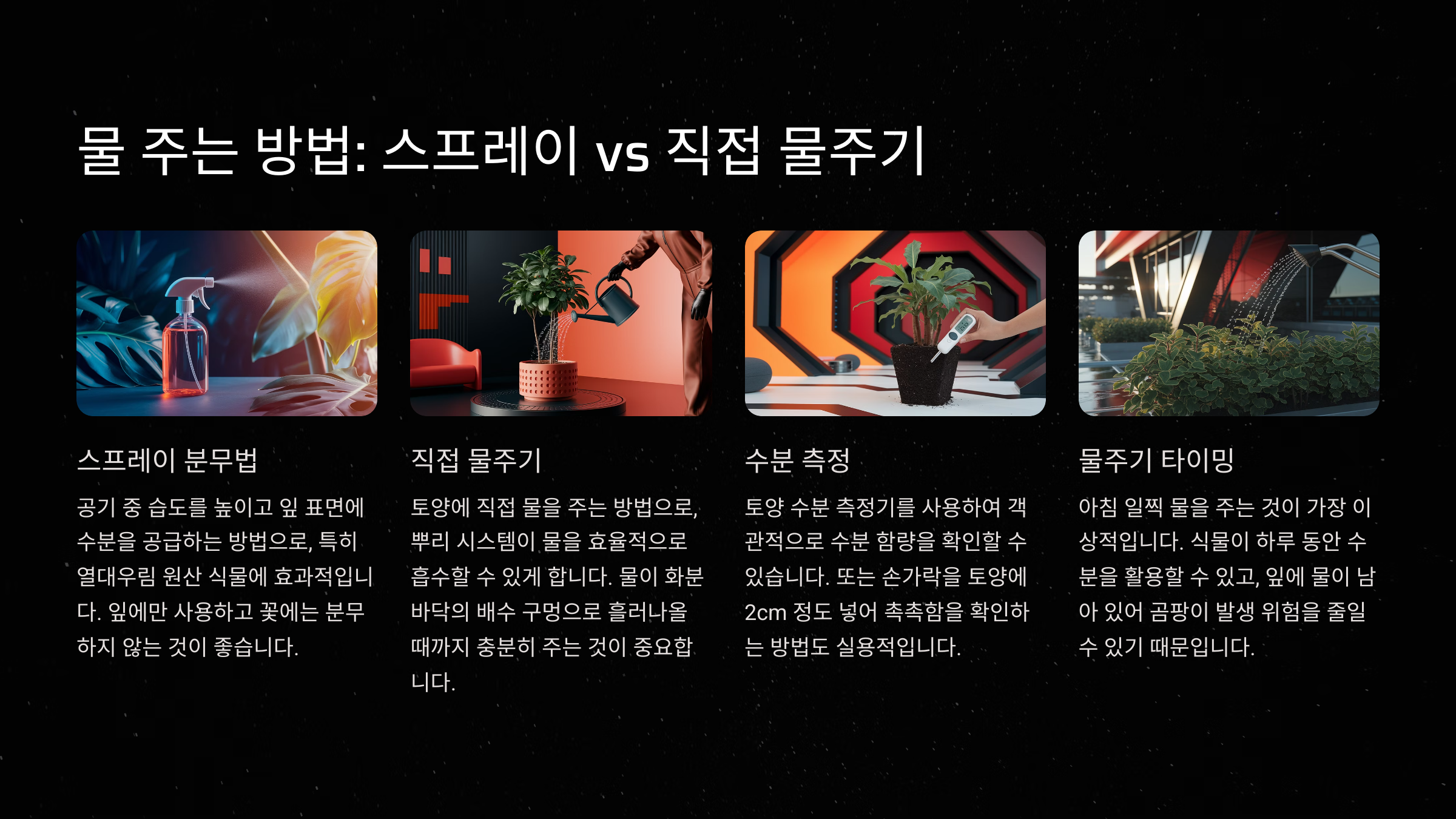 | 잎 스프레이 | 건조한 환경에서 습도 보충 | 잦을 경우 병 발생 위험↑ |