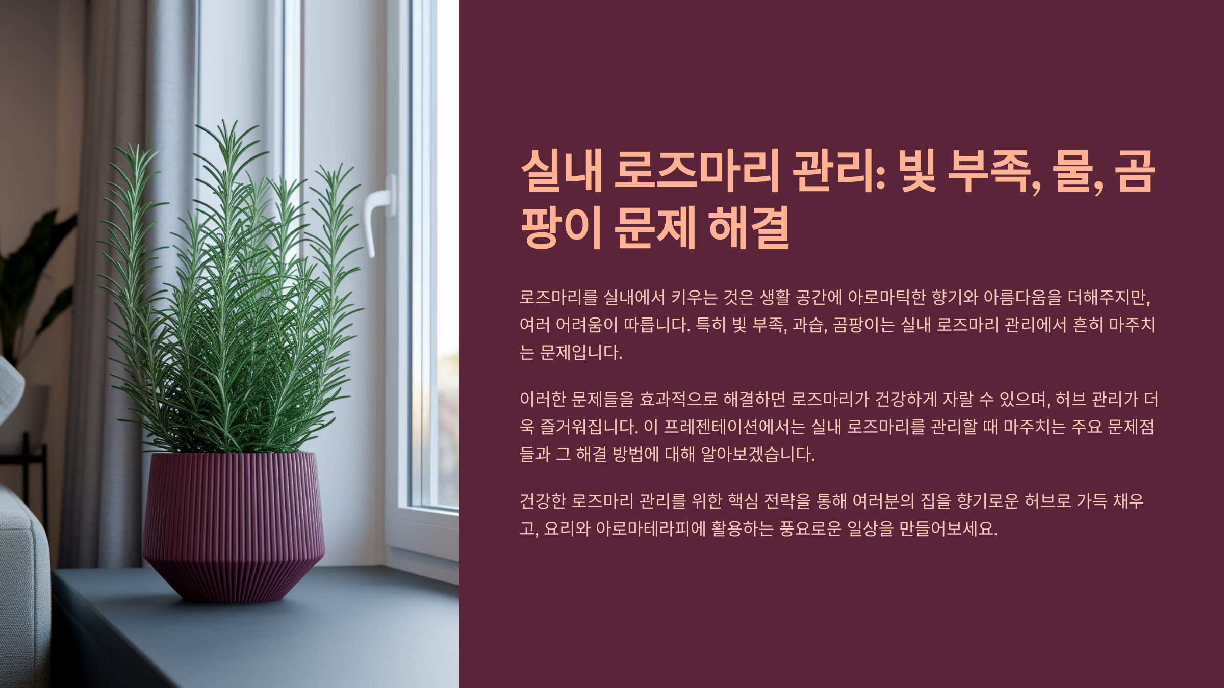 로즈마리는 기본적으로 햇빛을 좋아하는 식물이지만, 모든 환경이 햇빛이 넘치진 않죠. 실내에서 키우다 보면 햇빛 부족으로 시들거나 성장이 멈추는 경우가 정말 많아요. 특히 물 관리를 잘못하면 과습으로 바로 문제가 생기기도 해요. 🌫️