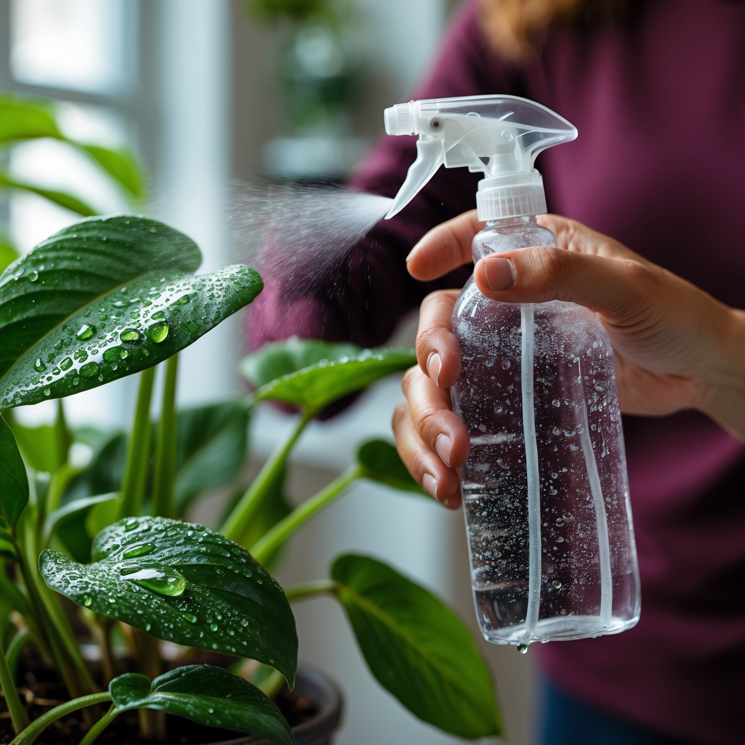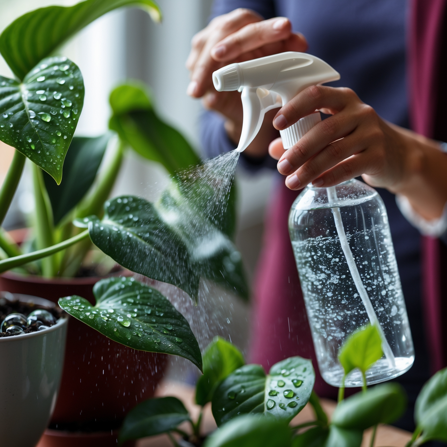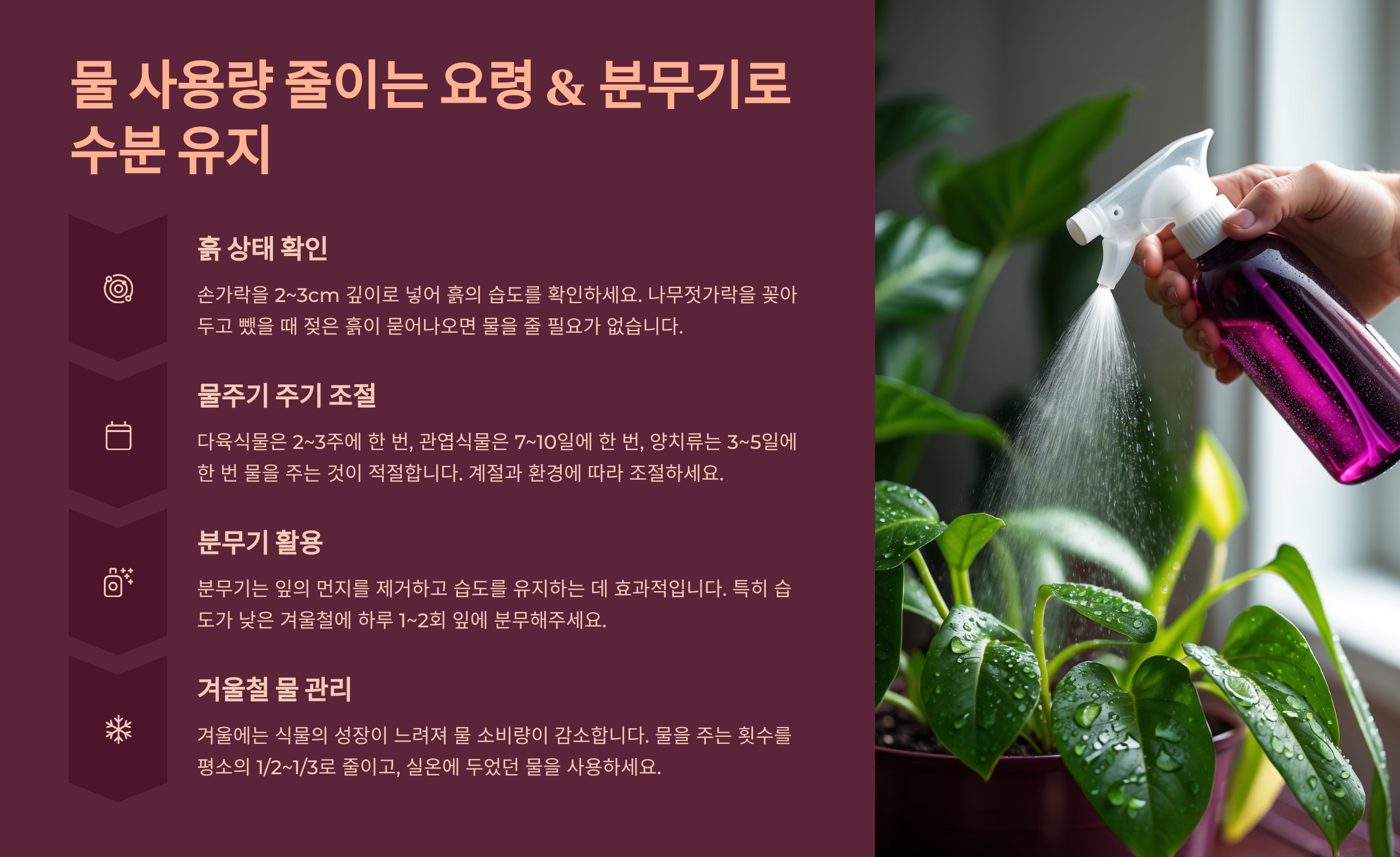 분무는 흙에 직접 하는 것이 아니라, 식물 주변 공기나 화분 가장자리에 가볍게 하는 게 좋아요. 잎에 직접 뿌리면 곰팡이 위험이 높아질 수 있어서 가볍게만 뿌리는 게 중요해요.