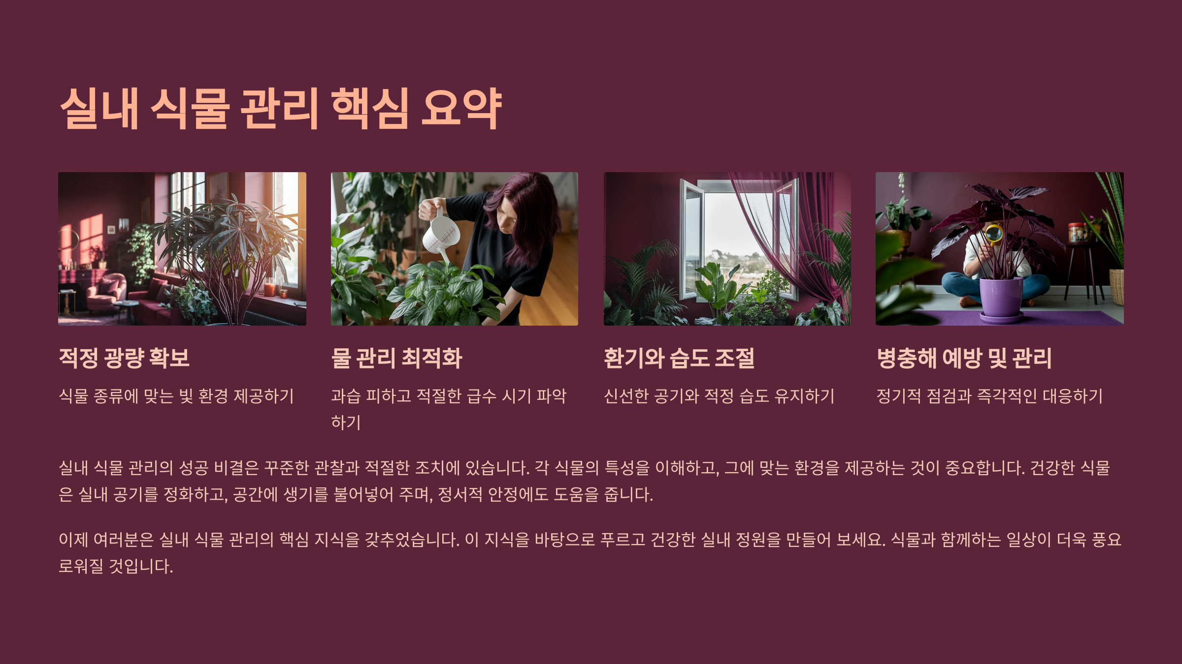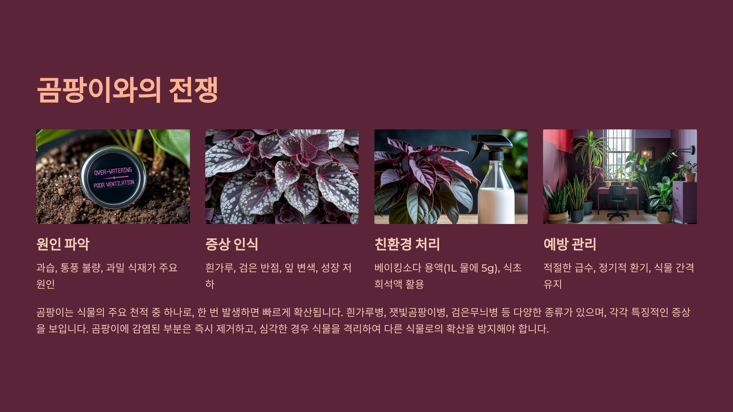예방을 위해선 평소 물을 주고 난 후 받침에 고인 물을 바로 비우고, 식물이 습한 공간에 너무 오래 있지 않도록 관리하는 게 중요해요. ‘곰팡이 없는 환경’은 결국 ‘잘 말리는 환경’이에요. 🧼