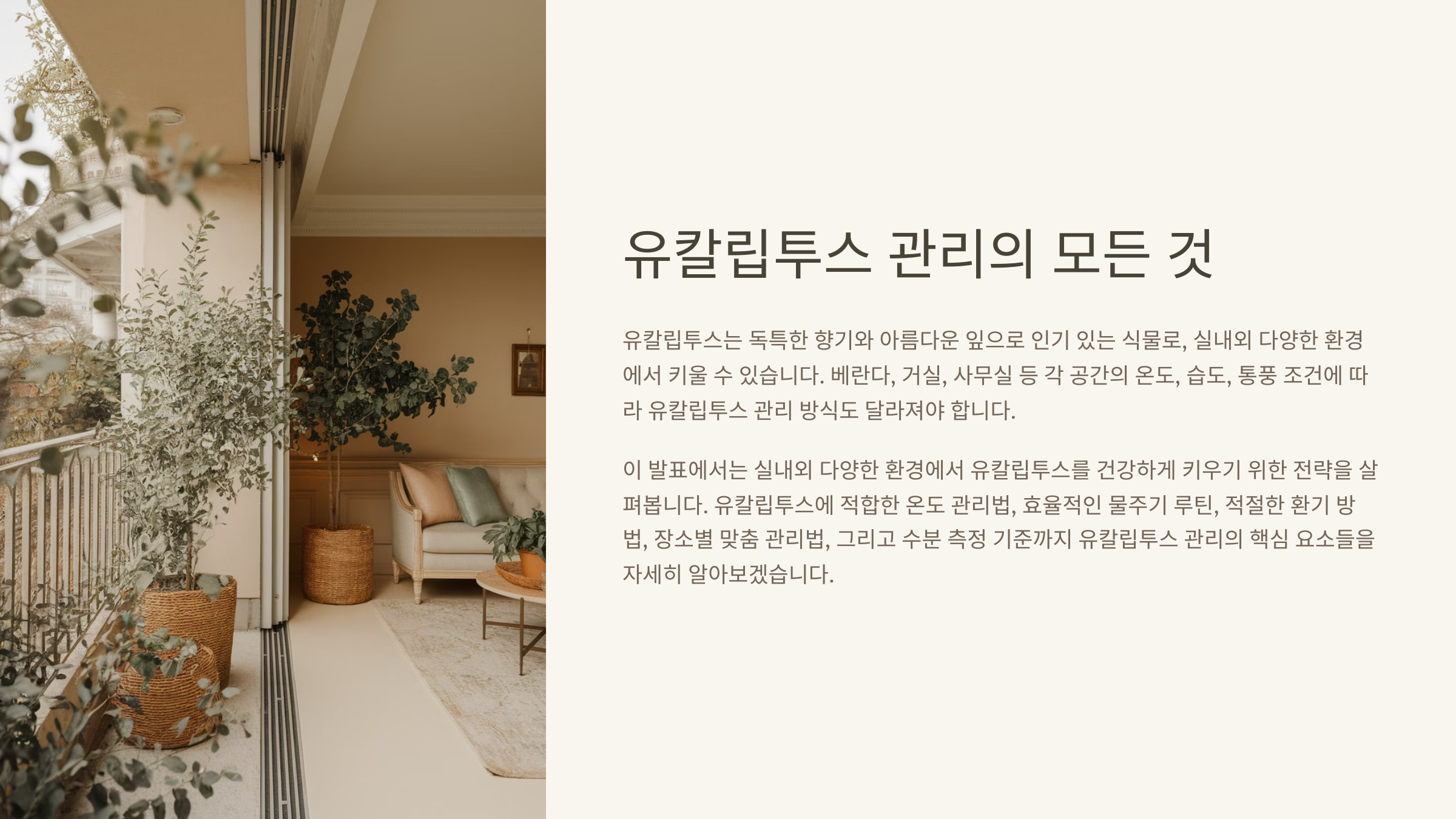 계절과 장소를 모두 고려해서 주기적으로 점검하는 습관이 필요하답니다. 같은 집에서도 유칼립투스 위치에 따라 완전히 다른 패턴이 만들어진다는 사실, 꼭 기억해 주세요!