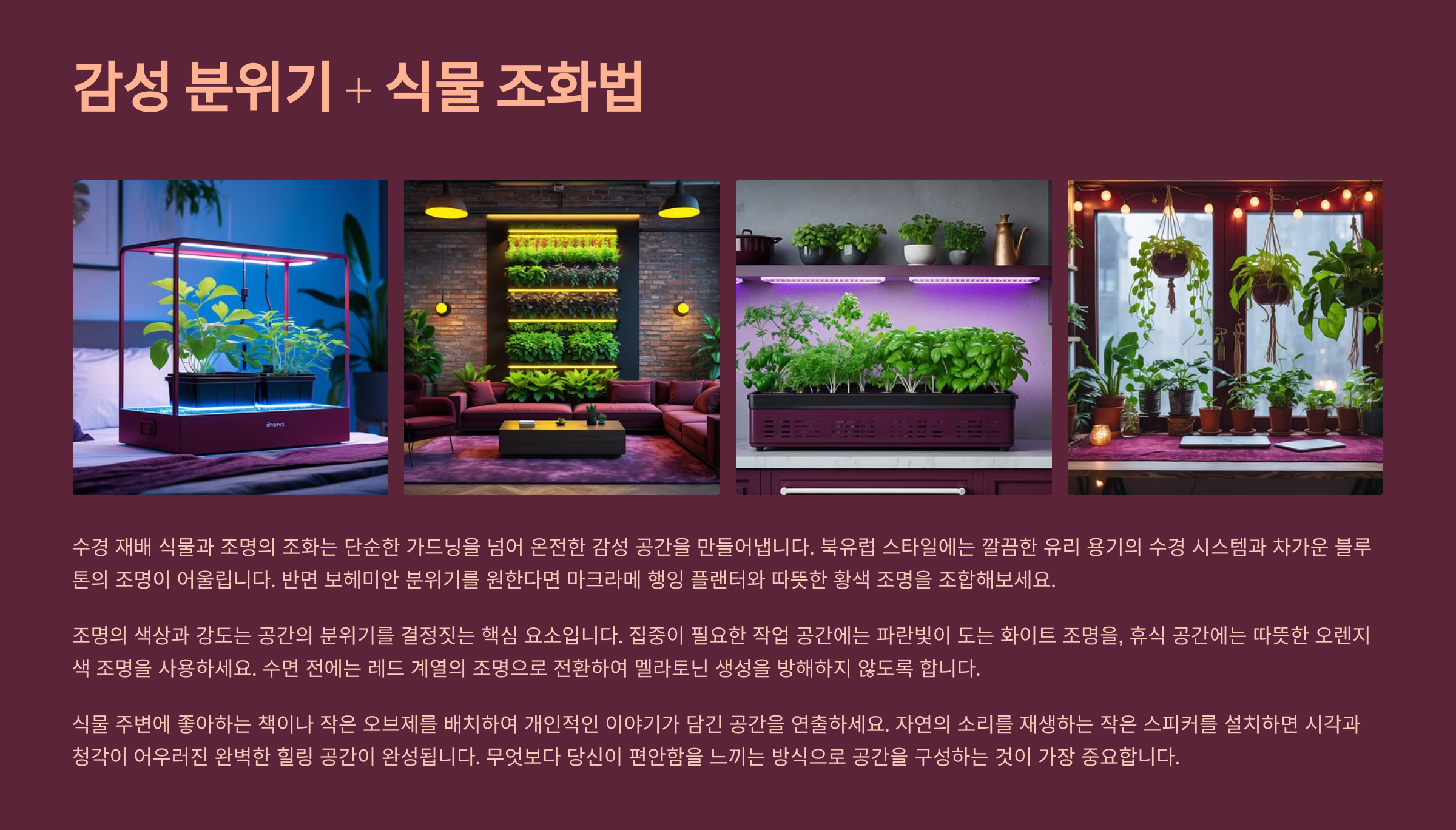 수경 식물과 조명은 각각이 아닌 함께할 때 진짜 아름다워져요. 조명의 각도, 색감, 위치만 조금만 바꿔도 분위기가 확 달라지니까 여러 조합을 시도해보면 좋을 거예요!