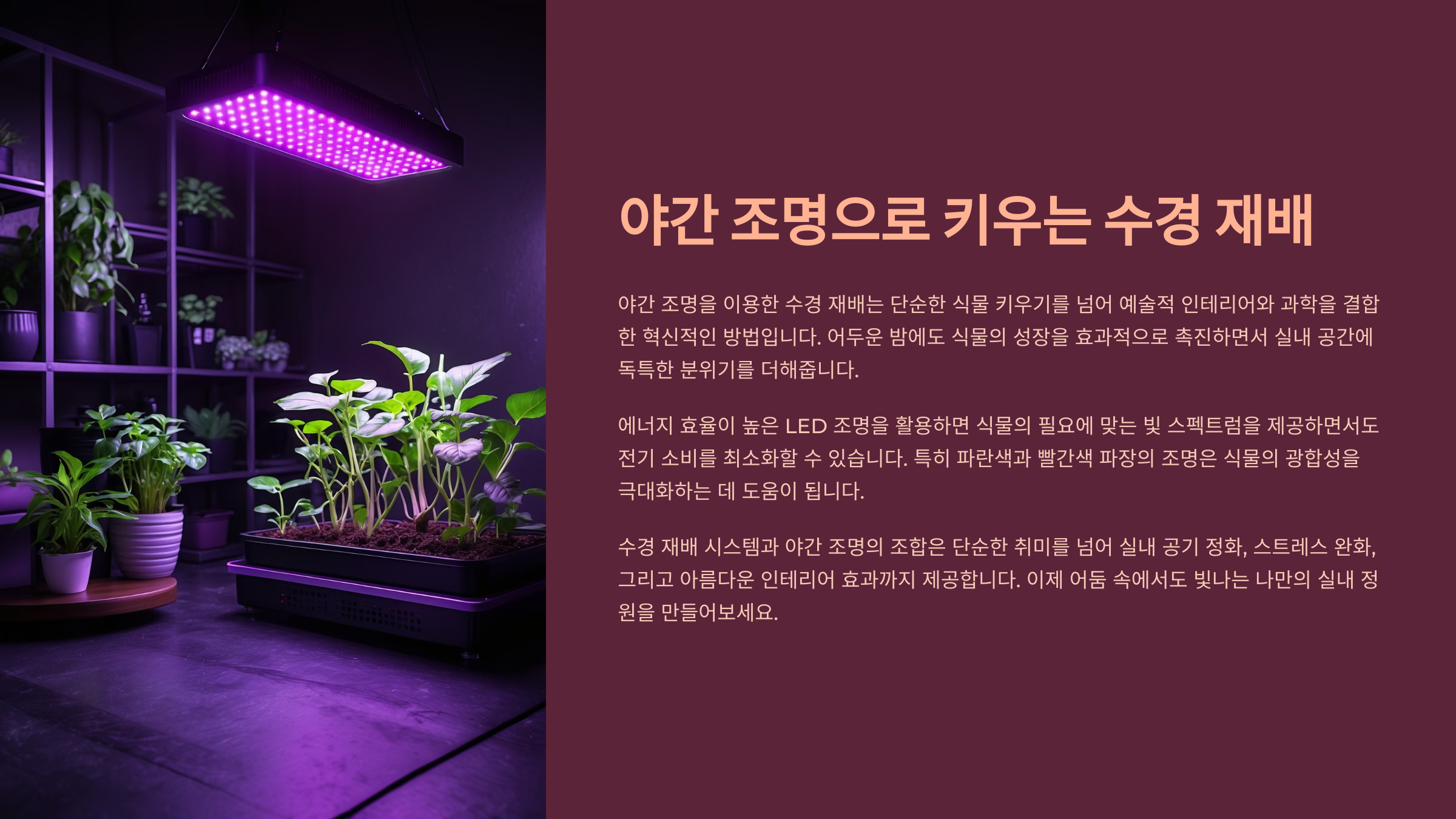 빛과 그림자의 조화, 물속의 반사와 초록 잎의 움직임은 야간 수경 재배의 진정한 매력을 만들어줘요. 이 작은 요소들이 모여서 우리만의 힐링 공간을 완성하게 되는 거죠.