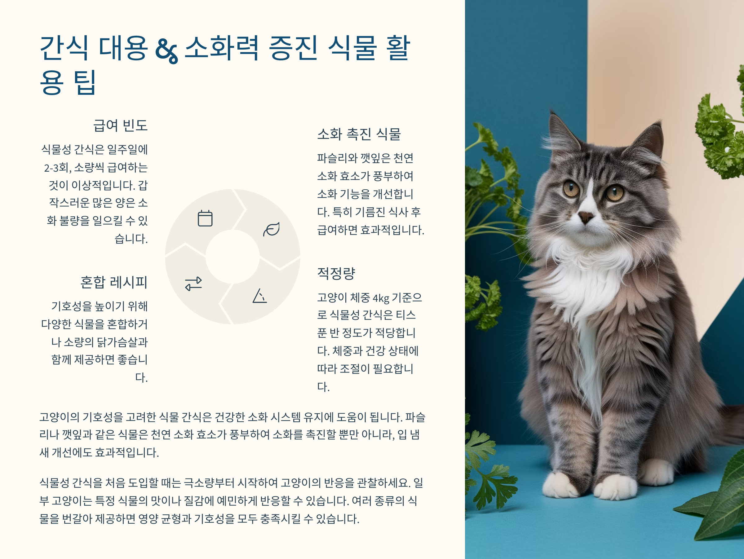 장 트러블은 한 번 시작되면 고질적으로 반복되기도 하니까, 평소에 식이관리와 함께 이러한 천연 식물을 꾸준히 급여하는 게 훨씬 효과적이에요. 건강한 장은 건강한 고양이 생활의 시작이죠! 😻