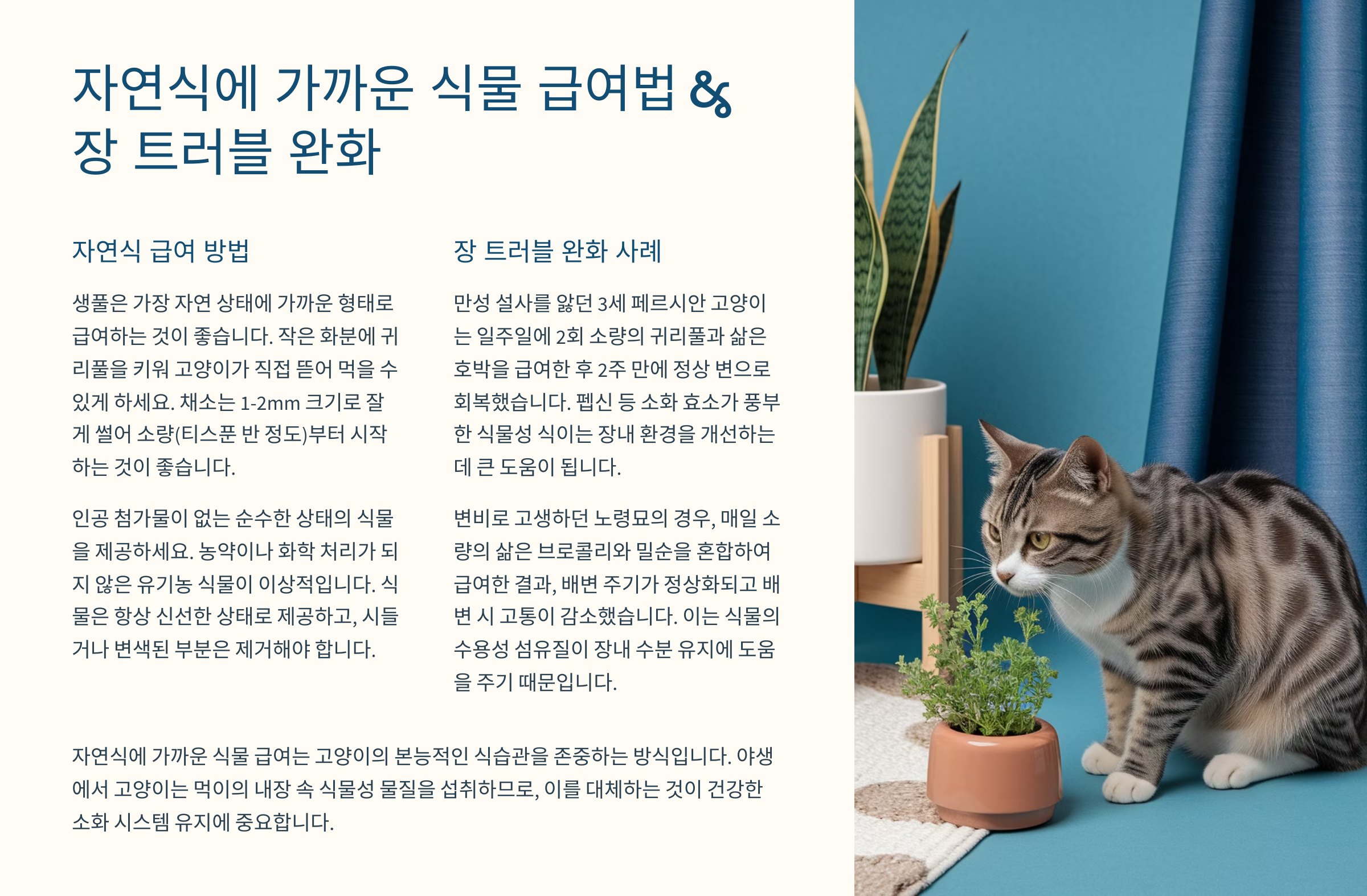 자연식에 가까운 식물 중 대표적인 예로는 '고구마잎', '방풍나물', 그리고 '클로버 새싹'이 있어요. 이 식물들은 자연에서 자라는 녹색 채소류로, 고양이의 위장에 부담을 주지 않으면서도 장내 유익균 증식에 도움을 줘요.