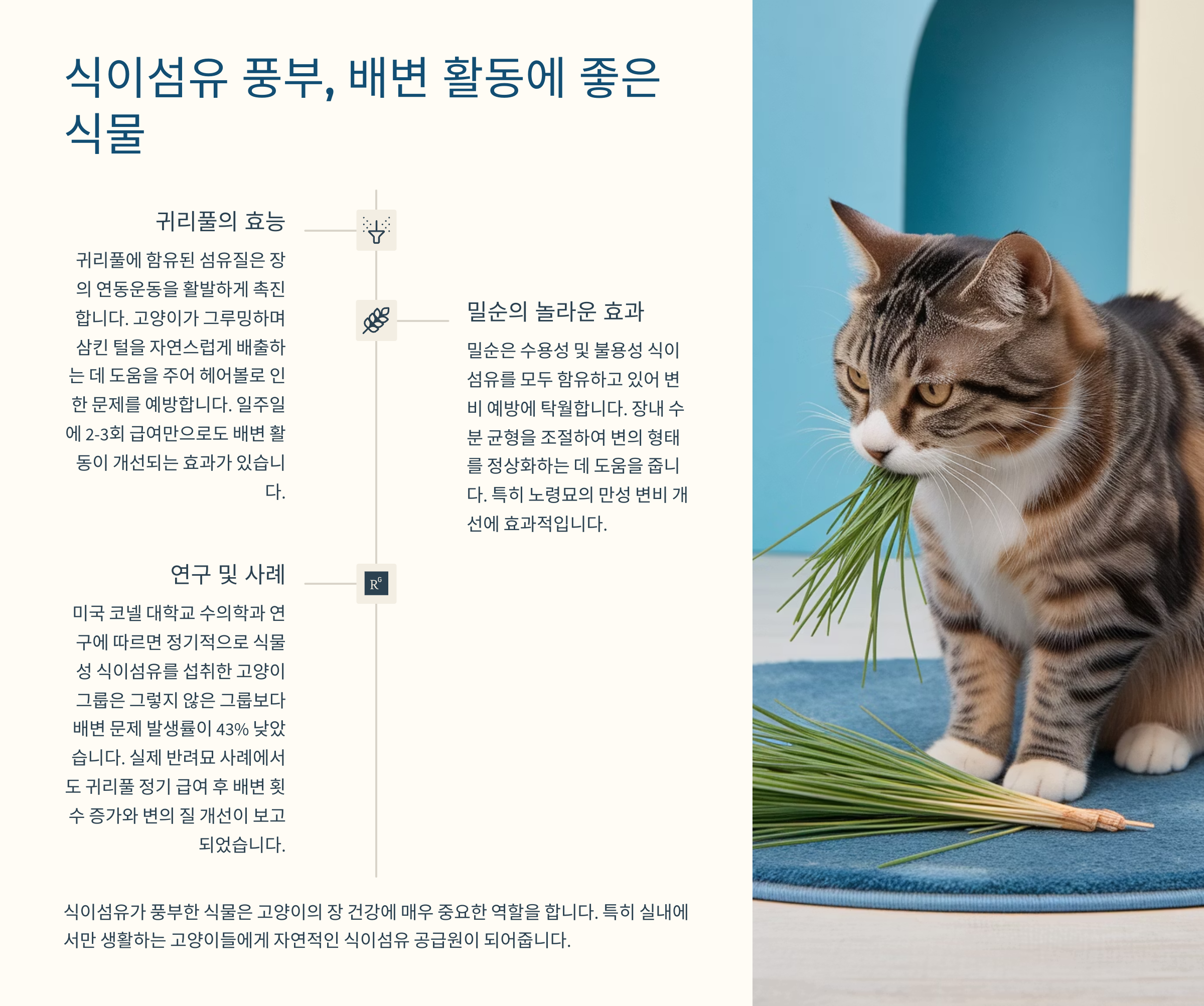 고양이의 배변 활동은 건강 상태를 보여주는 중요한 지표예요. 배변 횟수가 줄거나, 딱딱한 변이 계속된다면 장 기능이 원활하지 않다는 뜻일 수 있어요. 이럴 때 식물의 힘을 빌리는 것도 좋은 방법이죠.