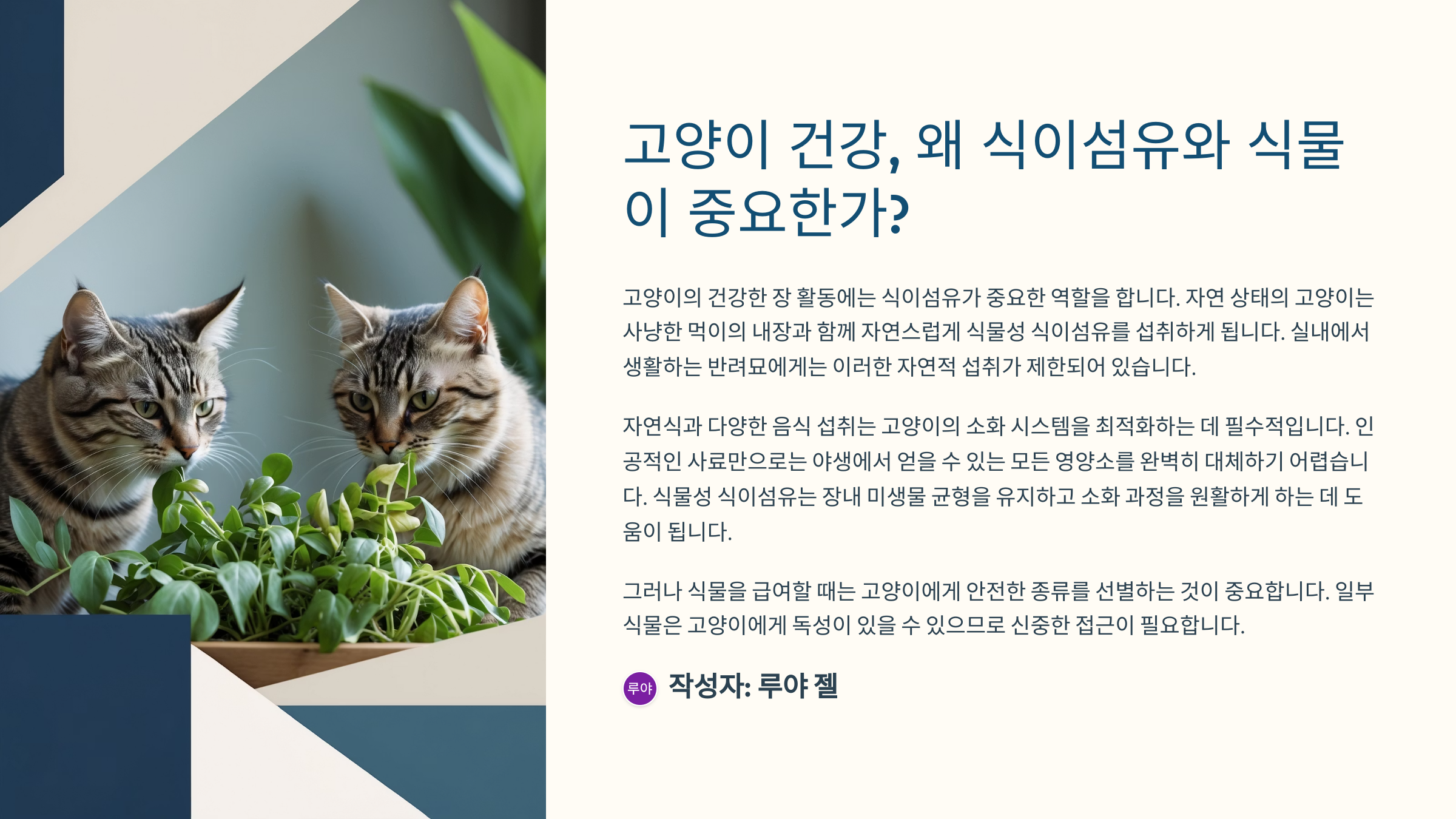 고양이의 장 트러블은 변비, 설사, 가스 참 등 다양한 형태로 나타날 수 있어요. 이럴 땐 약보다 일상 식단 조절이 효과적일 수 있답니다. 특히 식이섬유가 풍부한 식물은 고양이의 배변 리듬을 자연스럽게 도와줘요.