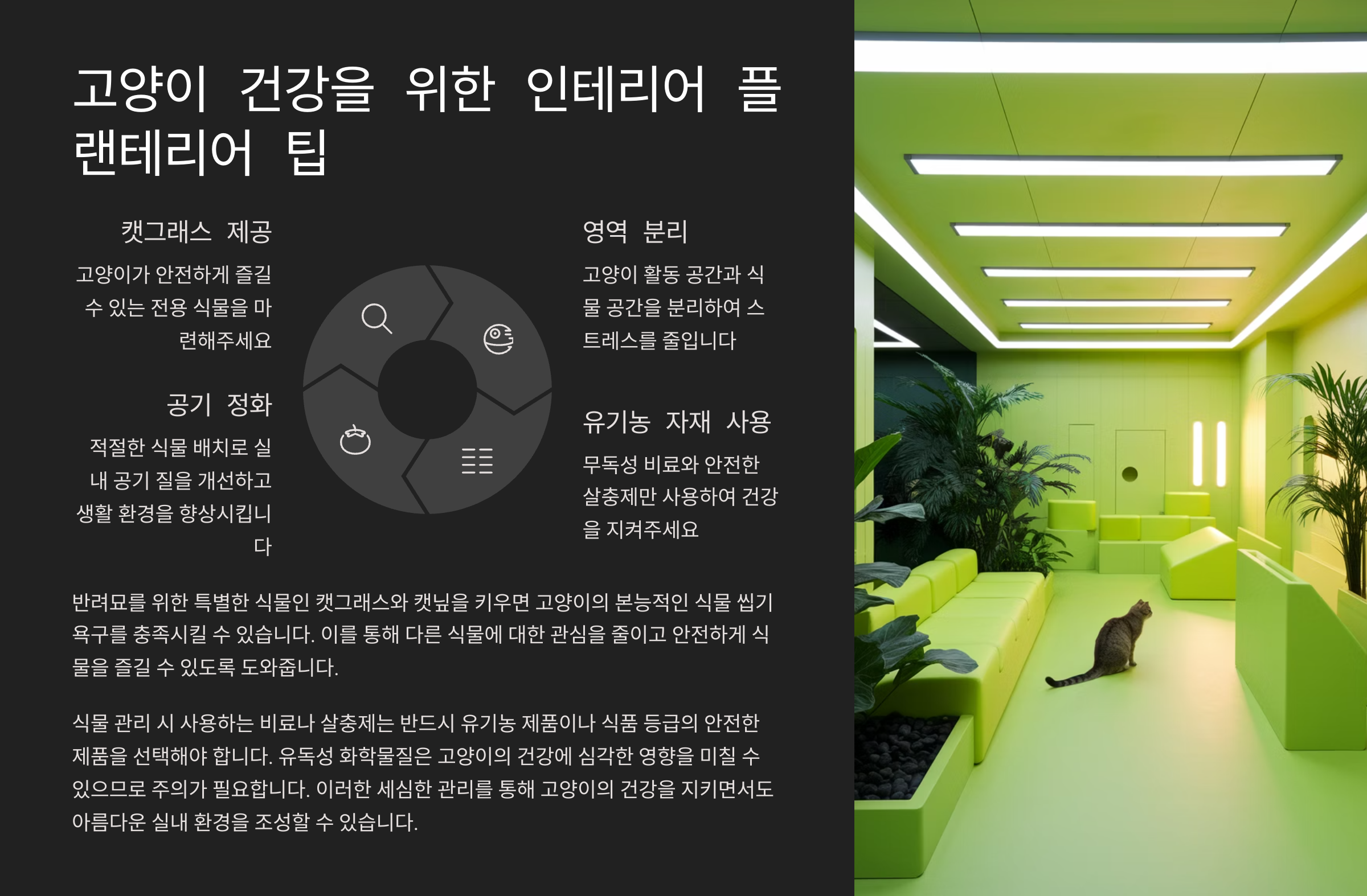 이처럼 식물 하나만 잘 선택해도 집 안 분위기가 확 바뀌어요. 특히 녹색 계열은 심리적으로 안정감을 주기 때문에 고양이뿐 아니라 사람에게도 긍정적인 효과를 준답니다.