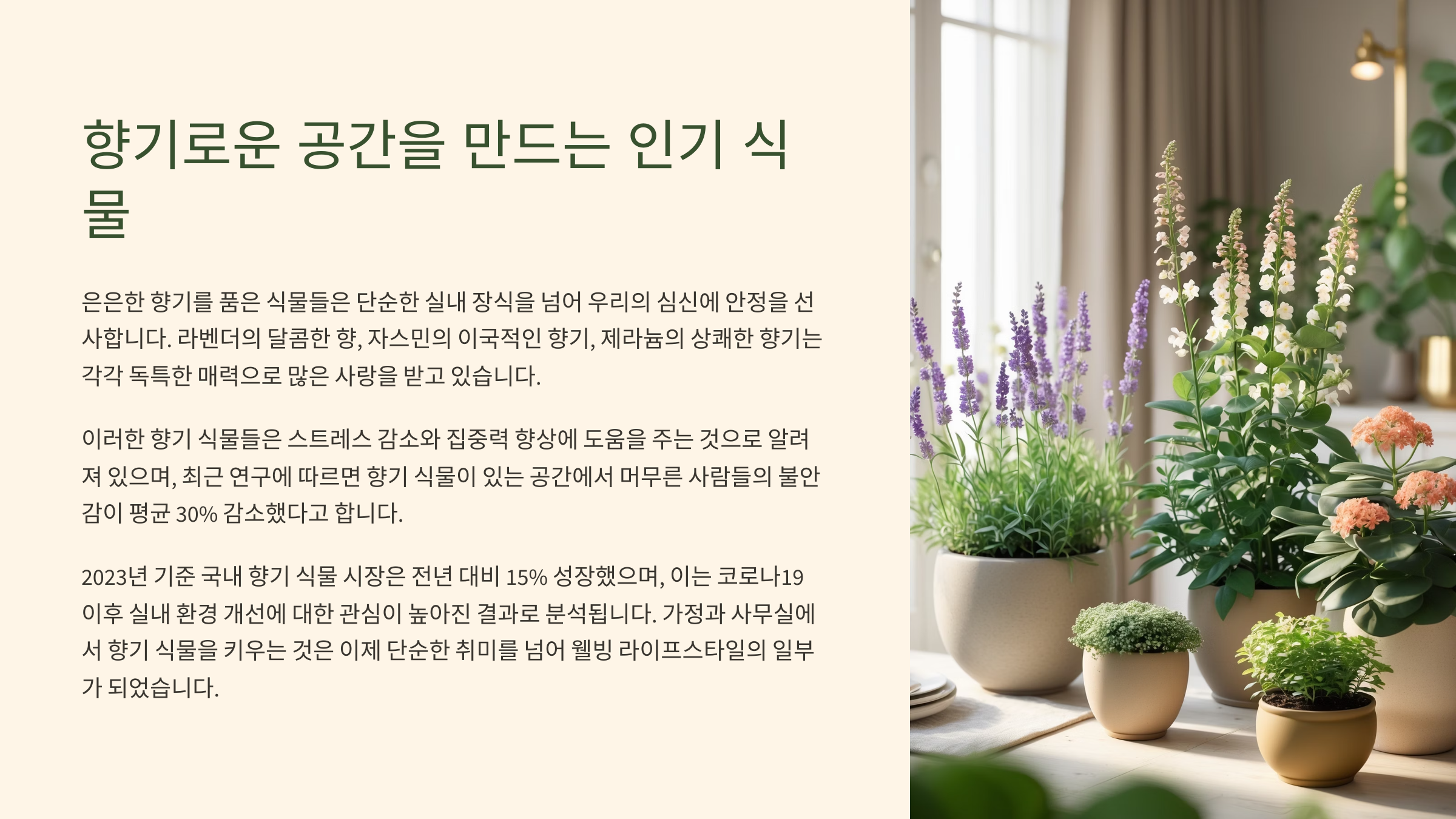 향기 화초는 정성스럽게 키울수록 더 깊은 향으로 보답해줘요. 작은 관심과 관리만으로도 집 안에 퍼지는 향이 달라지는 걸 느껴보세요. 그 향이 여러분의 하루를 더 특별하게 만들어줄 거예요. 🌸
