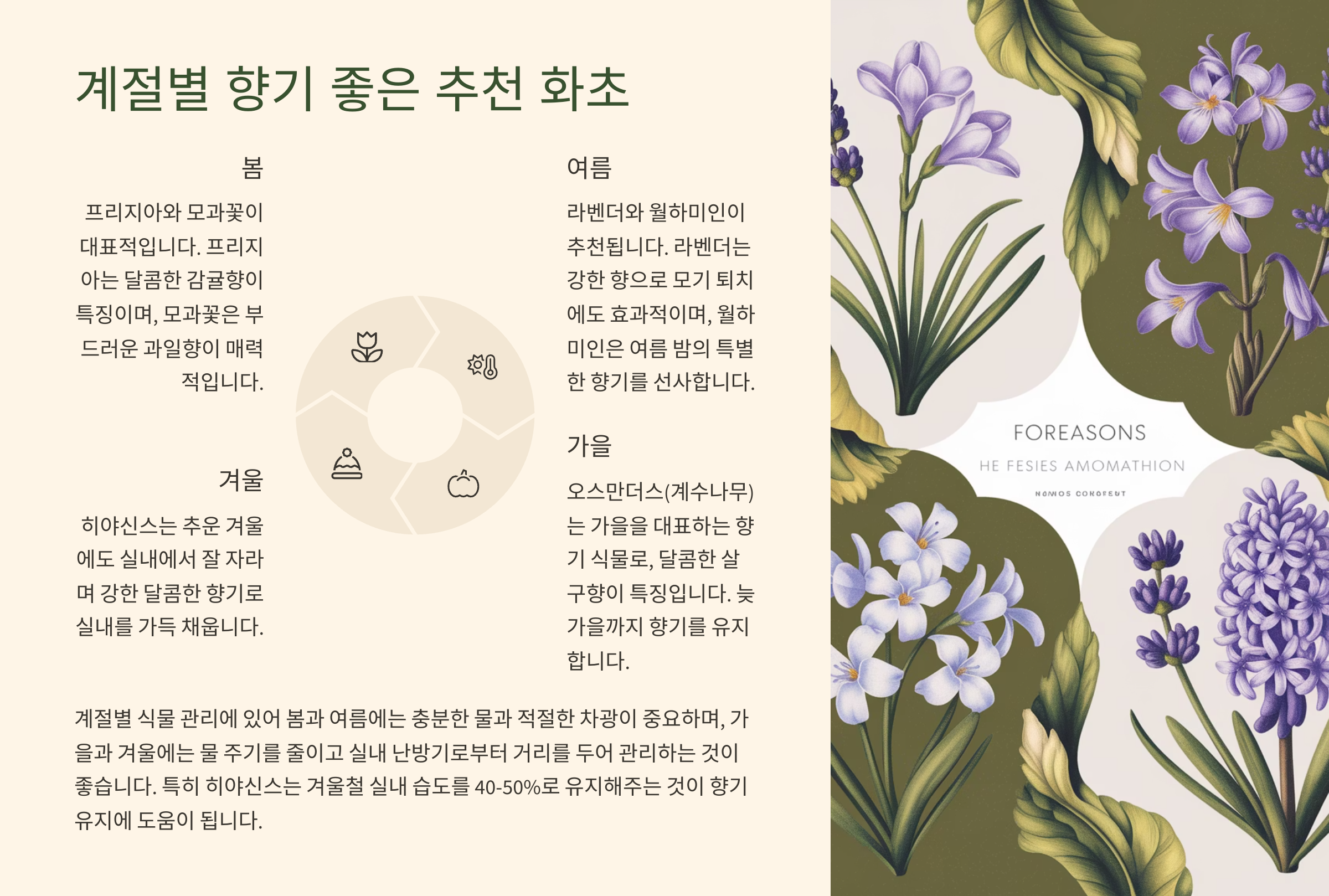 계절마다 피는 꽃이 다르듯, 향기 좋은 화초들도 계절별로 다양하게 있어요. 각 계절의 분위기와 잘 어울리는 향기 식물을 선택하면, 집 안이 계절에 따라 다른 매력을 지니게 돼요. 봄의 산뜻함, 여름의 시원함, 가을의 포근함, 겨울의 따스함을 식물로 느껴보세요.