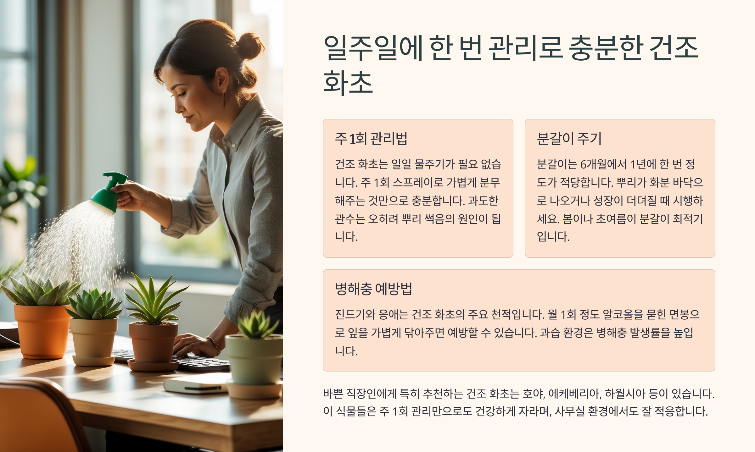 화분에 물 주는 게 자꾸 잊혀지거나 귀찮은 사람이라면, 물 없이도 잘 사는 건조 화초가 딱이에요. 특히 요즘처럼 바쁜 라이프스타일에는 손이 많이 가지 않으면서도 보기만 해도 기분 좋아지는 식물이 필요하잖아요? 🌵