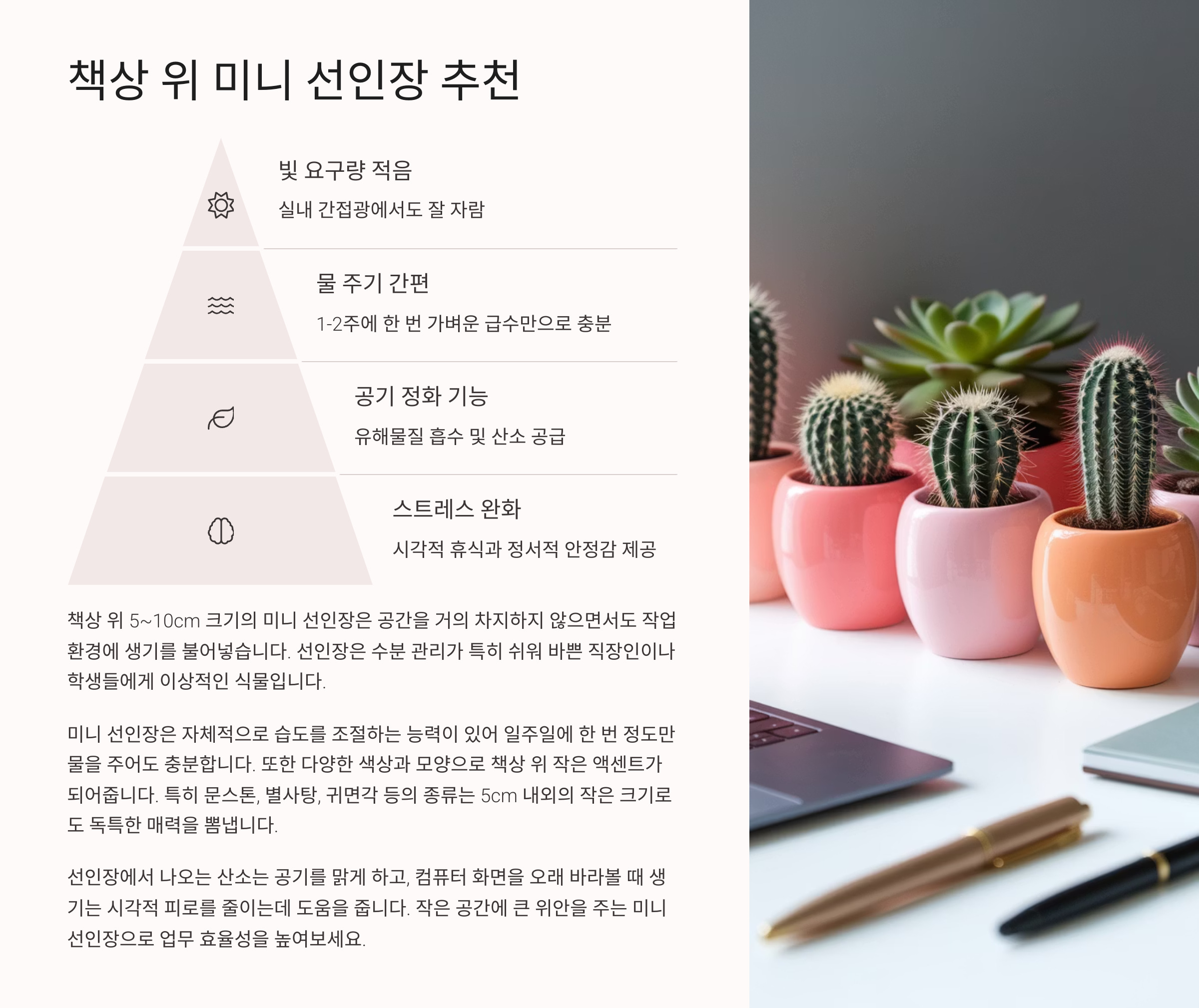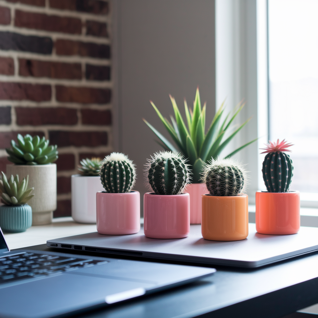 책상 위 미니 선인장은 집중력 향상에도 도움이 된다고 해요. 시선을 돌려 초록이를 한번 보는 것만으로도 스트레스가 줄어든다는 연구 결과도 있답니다. 그만큼 선인장은 실내 생활에 큰 위안을 주는 존재예요 🌱