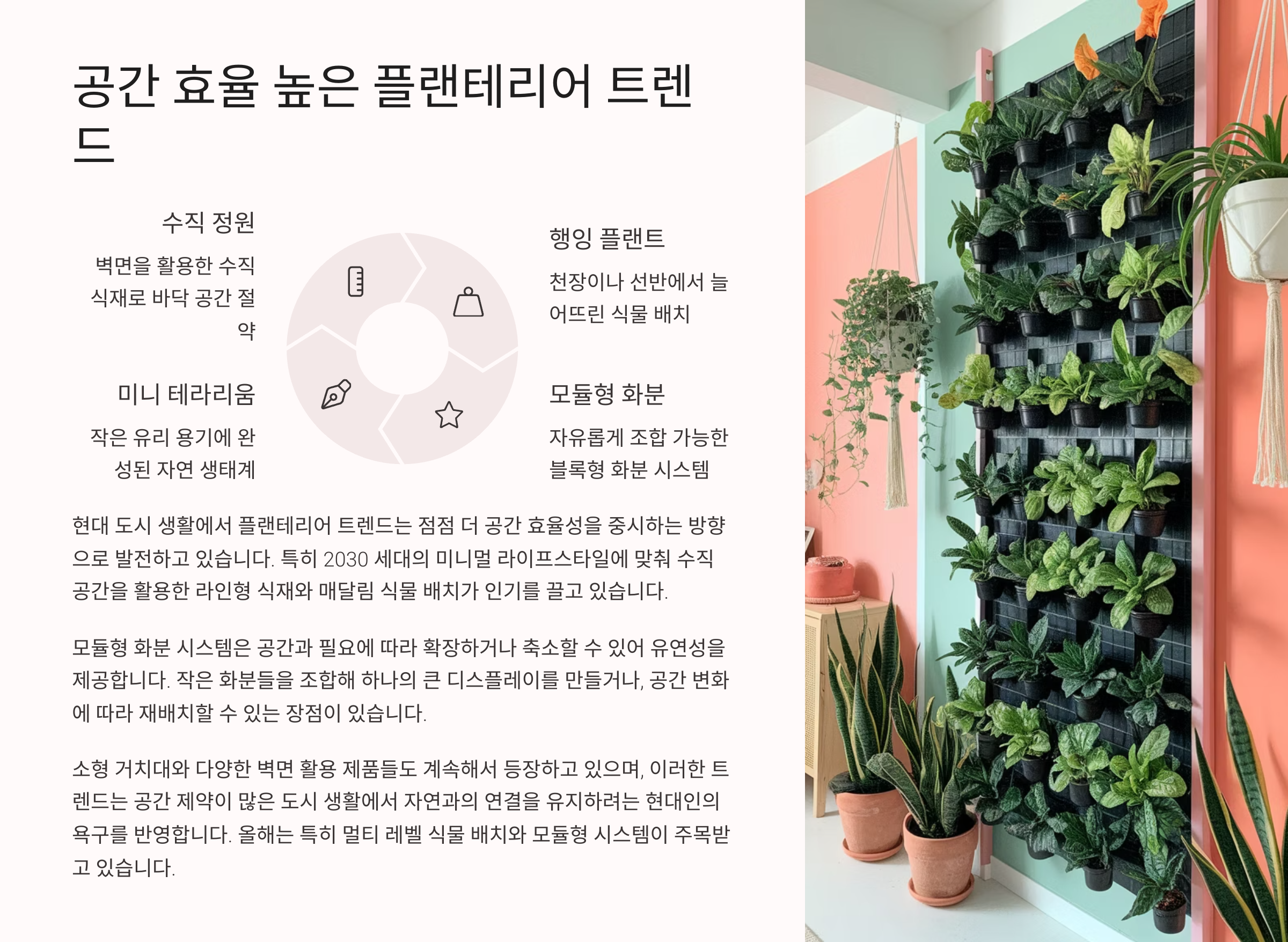 | 활용 아이템 | 공간 활용법 | 추천 식물 |