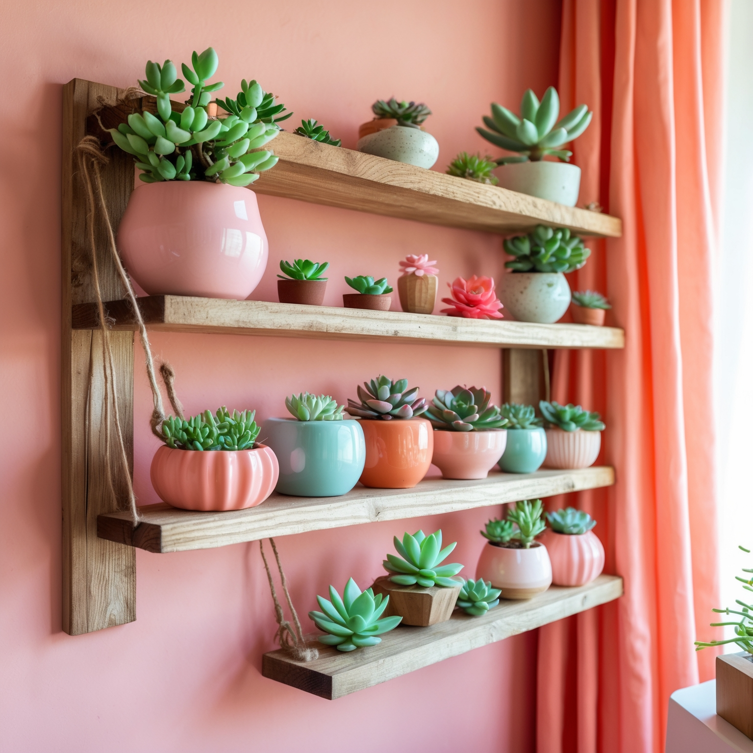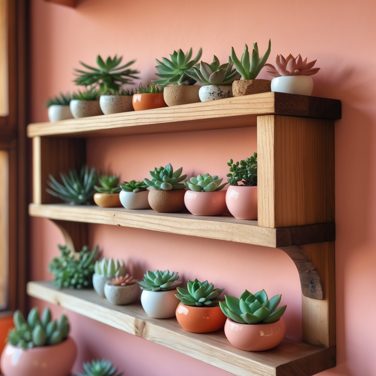 | 벽걸이 우드 선반 | 작은 식물 여러 개 배치 | 미니 선인장, 다육 |