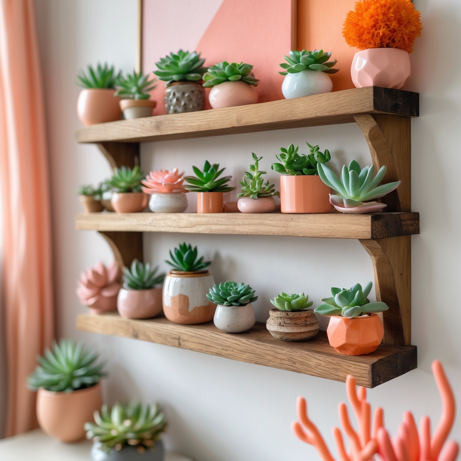 | 벽걸이 우드 선반 | 작은 식물 여러 개 배치 | 미니 선인장, 다육 |