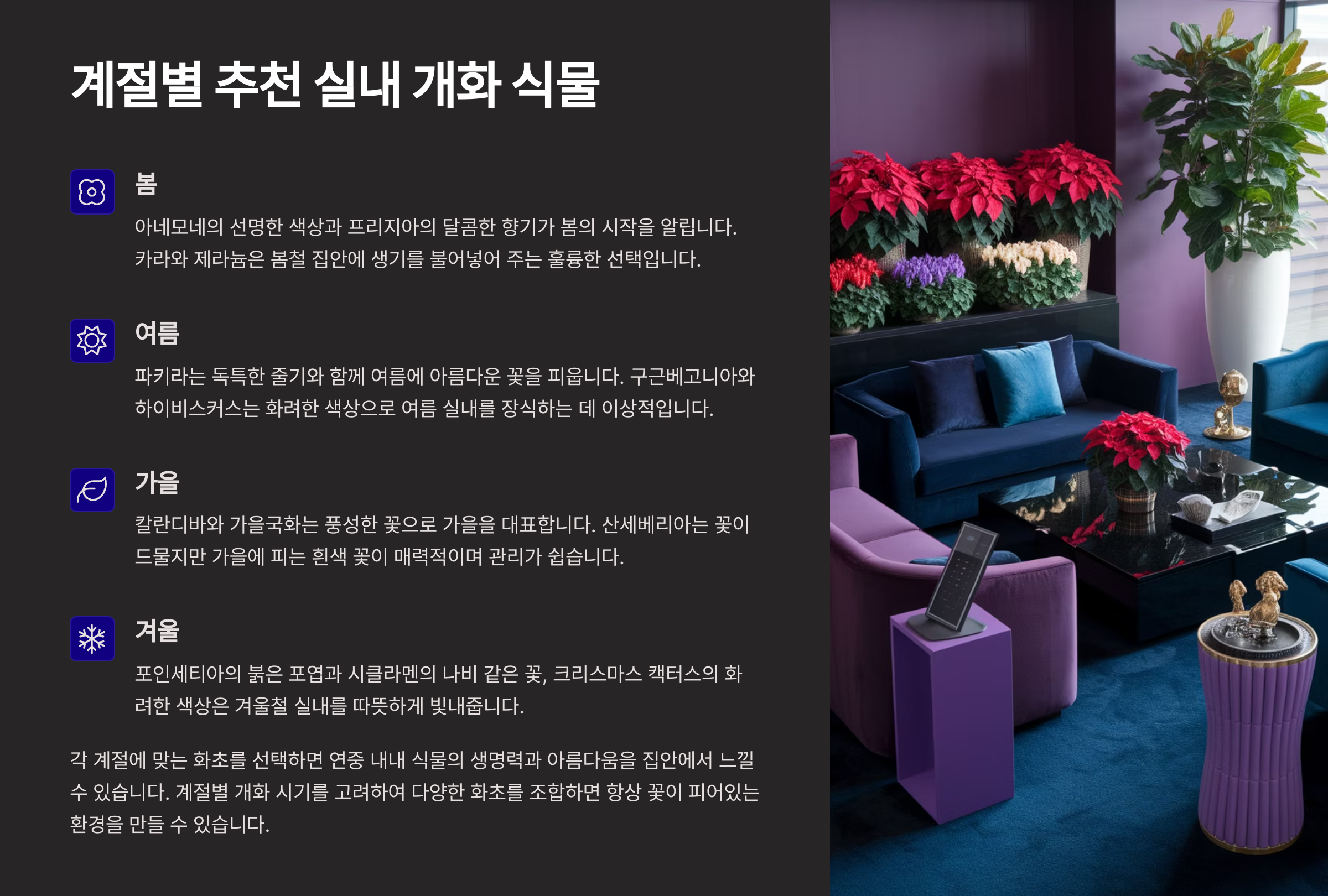 사계절 꽃을 보려면 각 계절에 잘 맞는 식물을 선택하는 것도 중요해요. 계절별로 추천하는 식물을 정리해봤어요. 어떤 꽃을 어느 시기에 데려오면 좋을지 참고해보세요! 📅