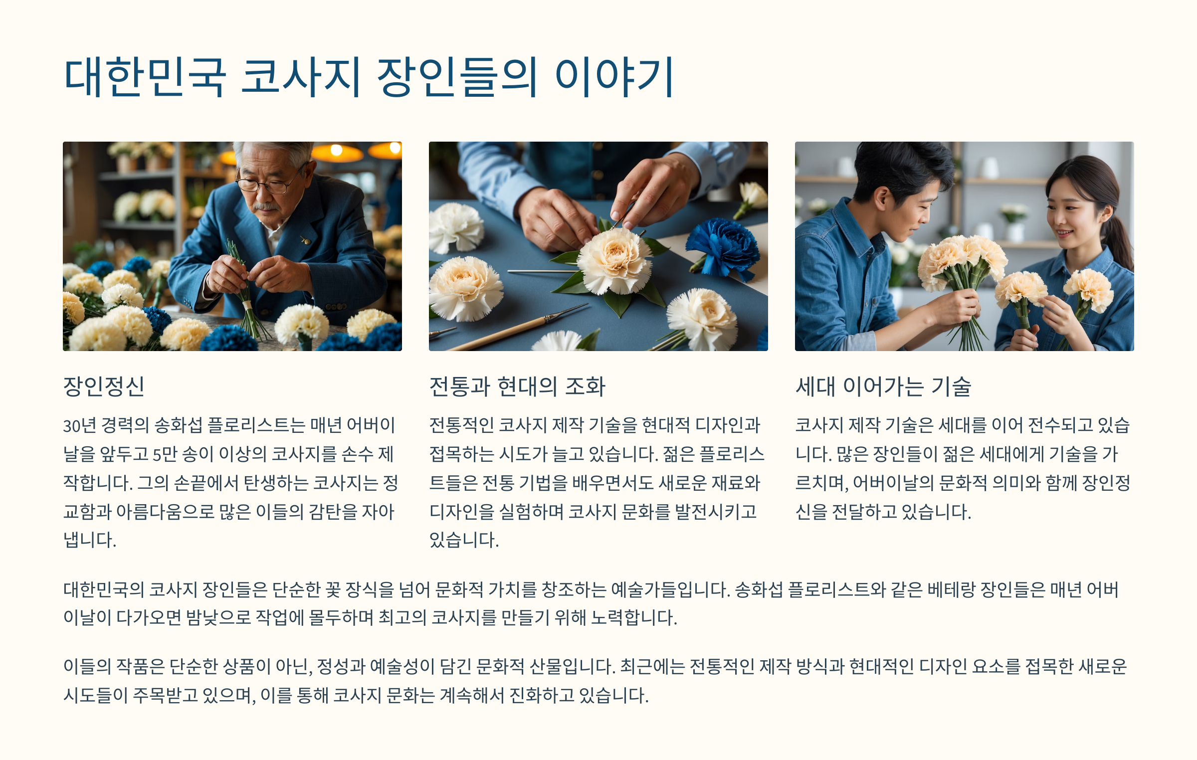 서울의 유명한 플라워샵에서는 5월이 되면 코사지 주문이 폭주한대요. 장인들은 부모님 한 분 한 분을 생각하며 맞춤형 코사지를 제작해요. 어떤 분은 '소박하지만 따뜻하게', 또 어떤 분은 '화려하고 기품있게' 요청하시기도 해요.