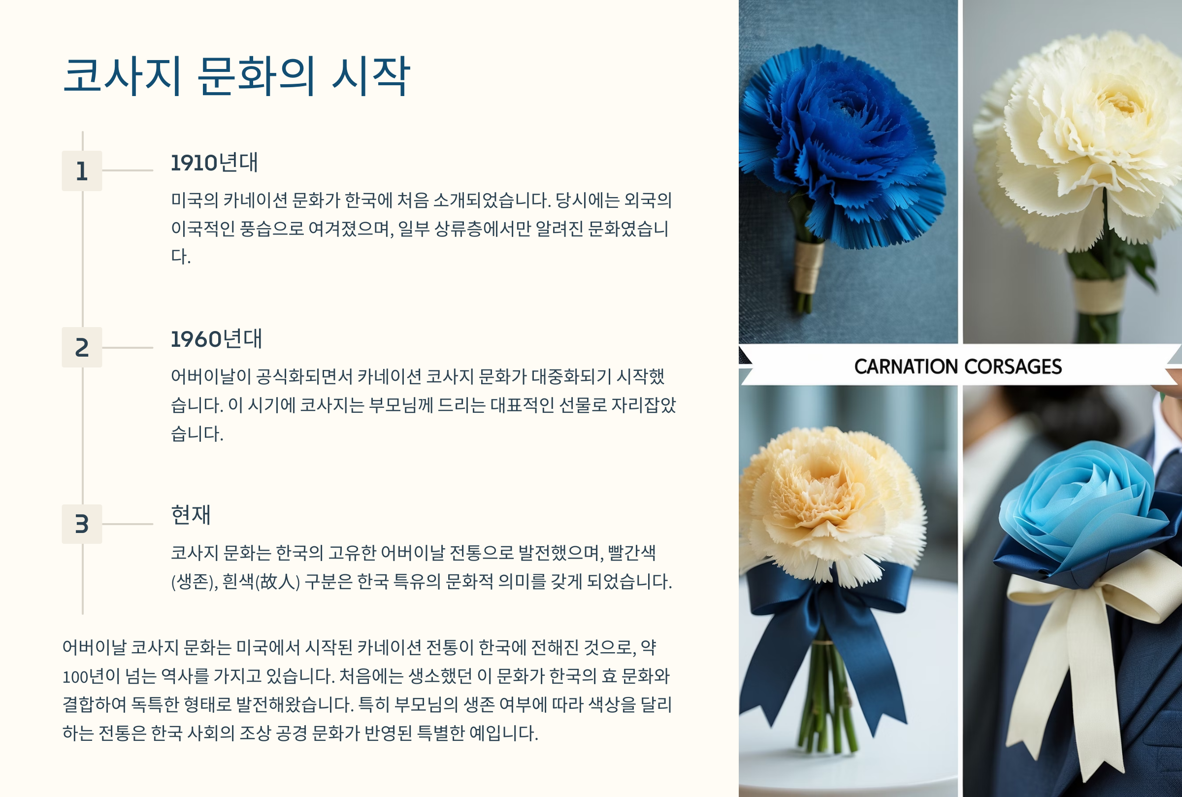 이번 글에서는 어버이날 코사지의 역사와 비화, 그리고 코사지를 고를 때 알아두면 좋은 꿀팁까지 하나하나 파헤쳐볼 거예요! 읽다 보면 부모님께 드리는 코사지가 훨씬 특별해질 거예요. 기대해도 좋아요!