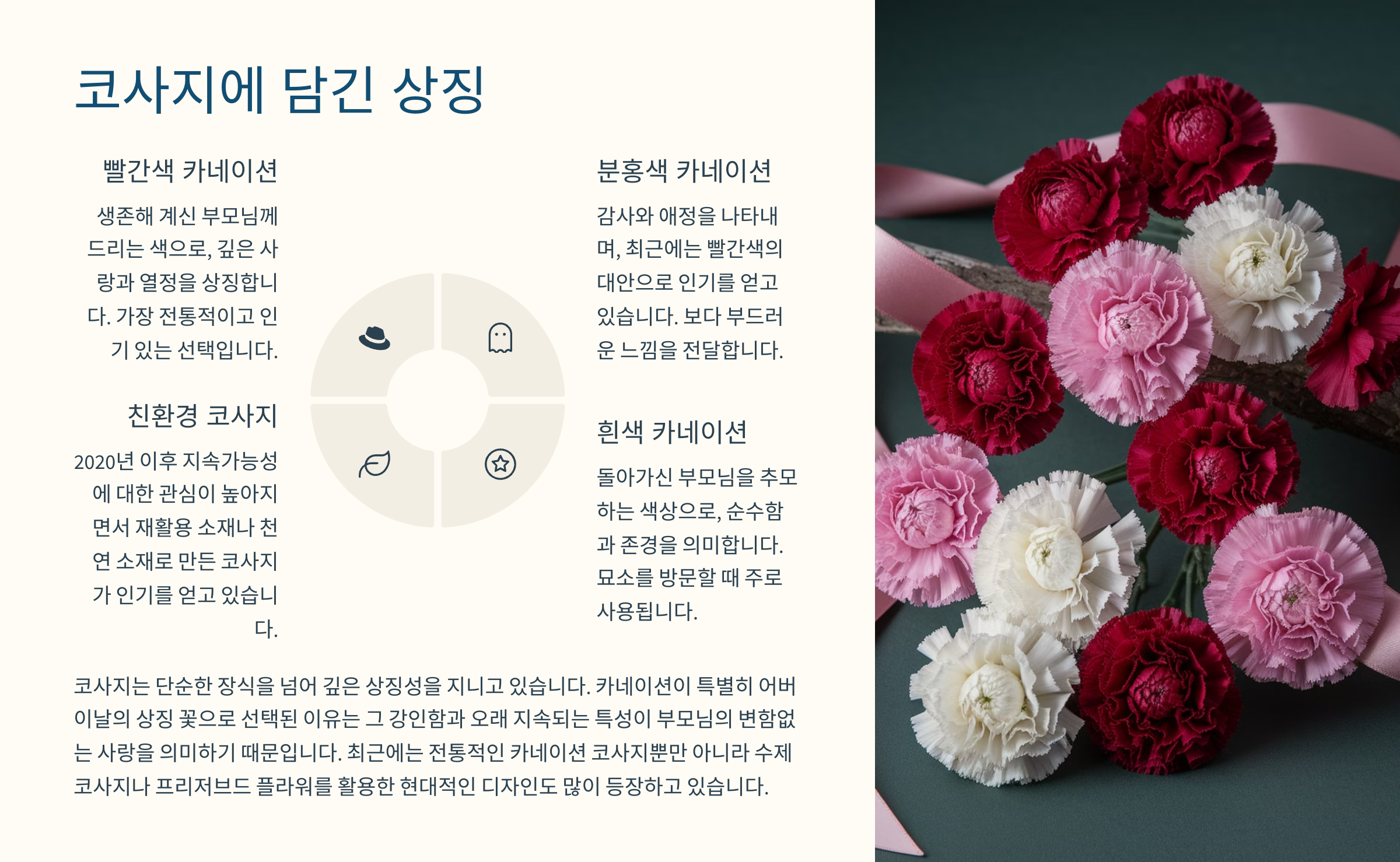 코사지 하나에도 이렇게 다양한 상징과 메시지가 담겨있다는 걸 알게 되면, 부모님께 달아드릴 때 훨씬 더 진심을 담을 수 있을 거예요.